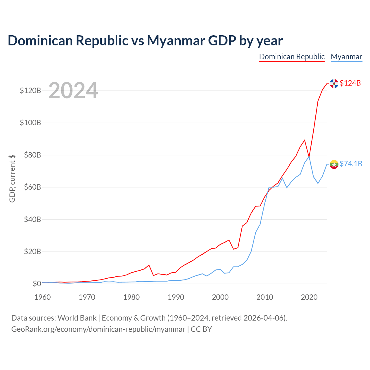 The Dominican Republic has a GDP of $124B compared to $74.1B for Myanmar, ranking 63/197 and 85/197 by economy size, respectively.
