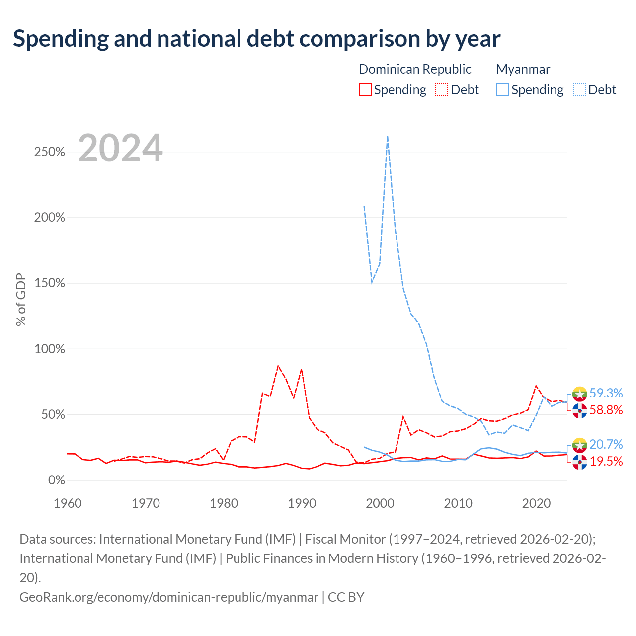 The Dominican Republic has $73.1B in government debt (58.8% of GDP), compared to $44B (59.3% of GDP) in Myanmar.