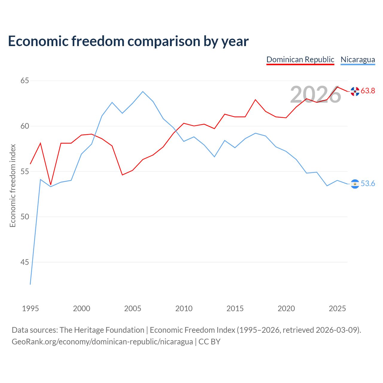The Economic Freedom Index for the Dominican Republic is 63.8, ranking 77/197, compared to 53.6 for Nicaragua, ranking 139/197. The chart above displays a comparison of annual changes in economic freedom indexes.
