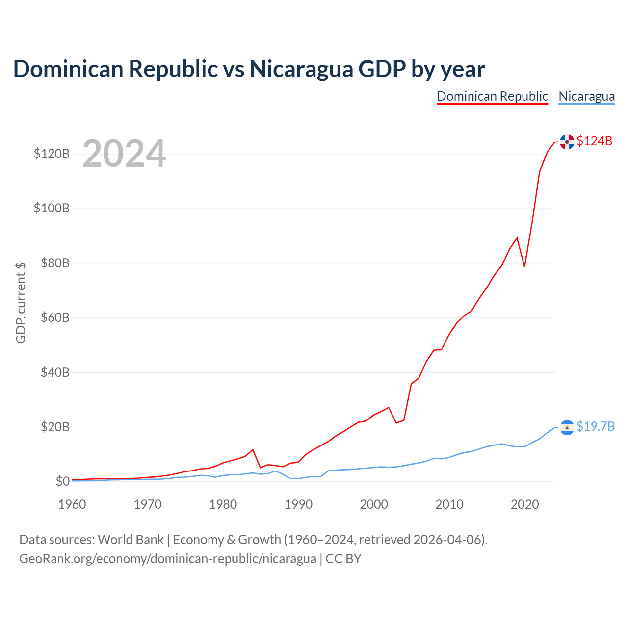 The Dominican Republic has a GDP of $124B compared to $19.7B for Nicaragua, ranking 63/197 and 131/197 by economy size, respectively.