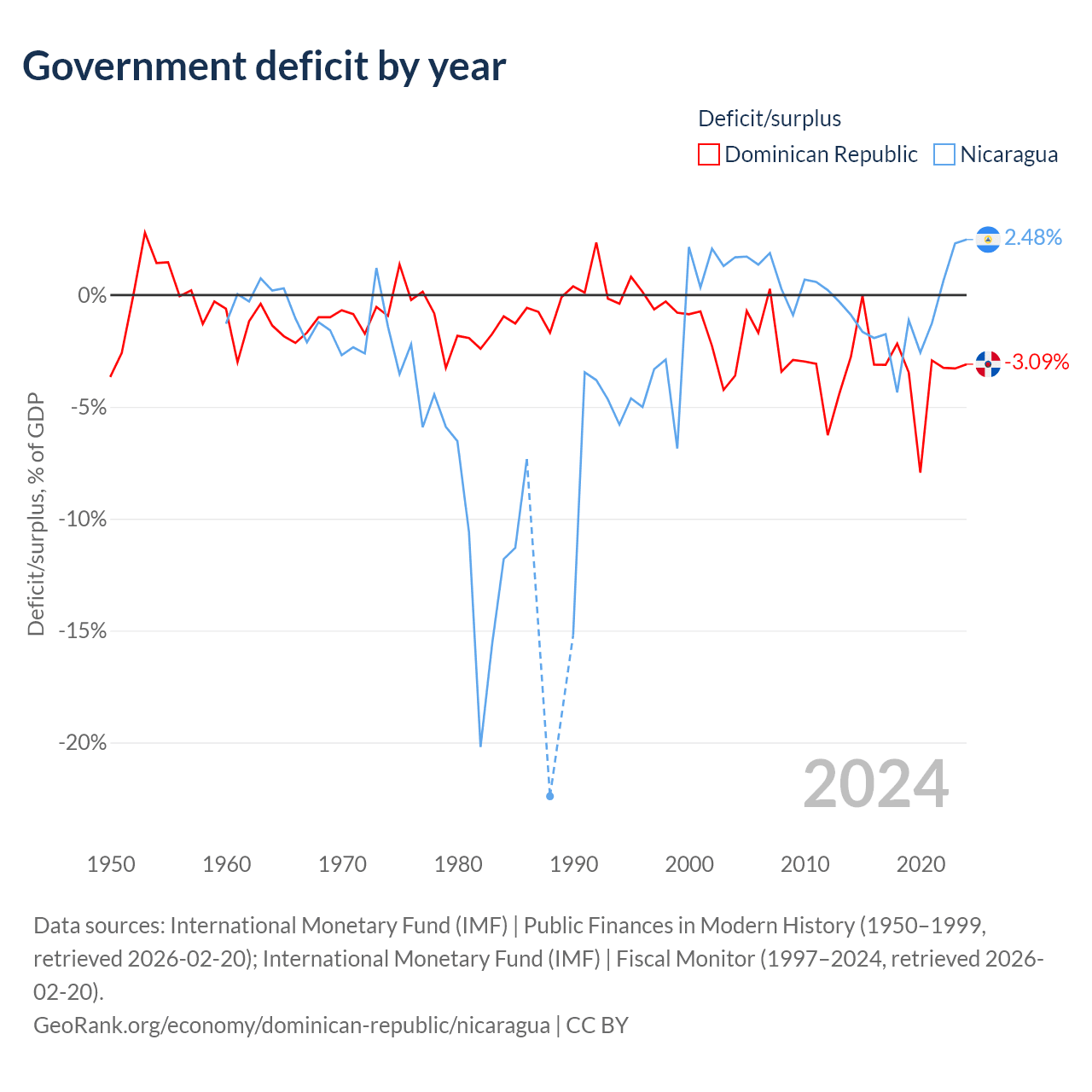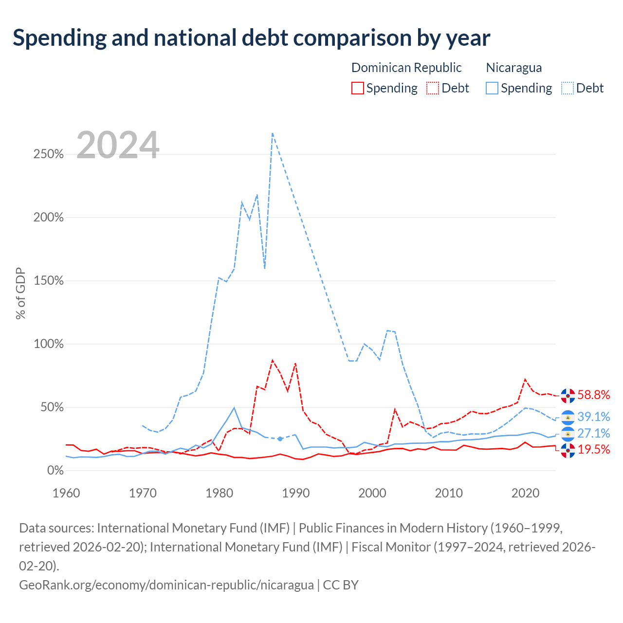 The Dominican Republic has $73.1B in government debt (58.8% of GDP), compared to $7.71B (39.1% of GDP) in Nicaragua.