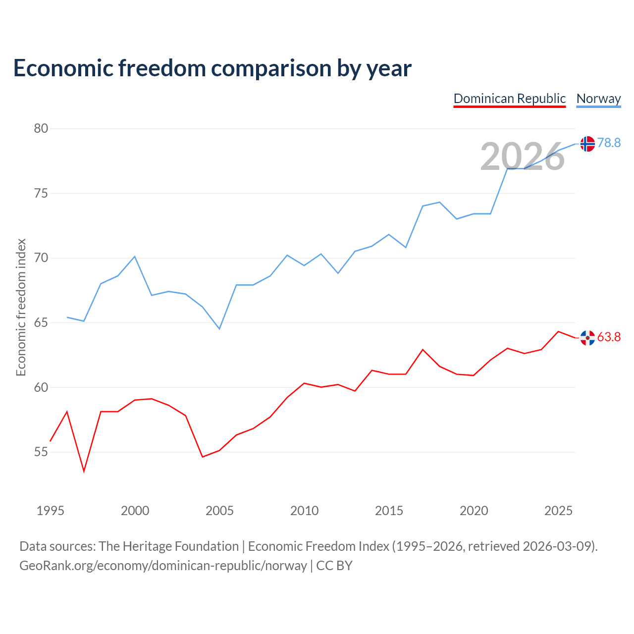 The Economic Freedom Index for the Dominican Republic is 63.8, ranking 77/197, compared to 78.8 for Norway, ranking 9/197. The chart above displays a comparison of annual changes in economic freedom indexes.