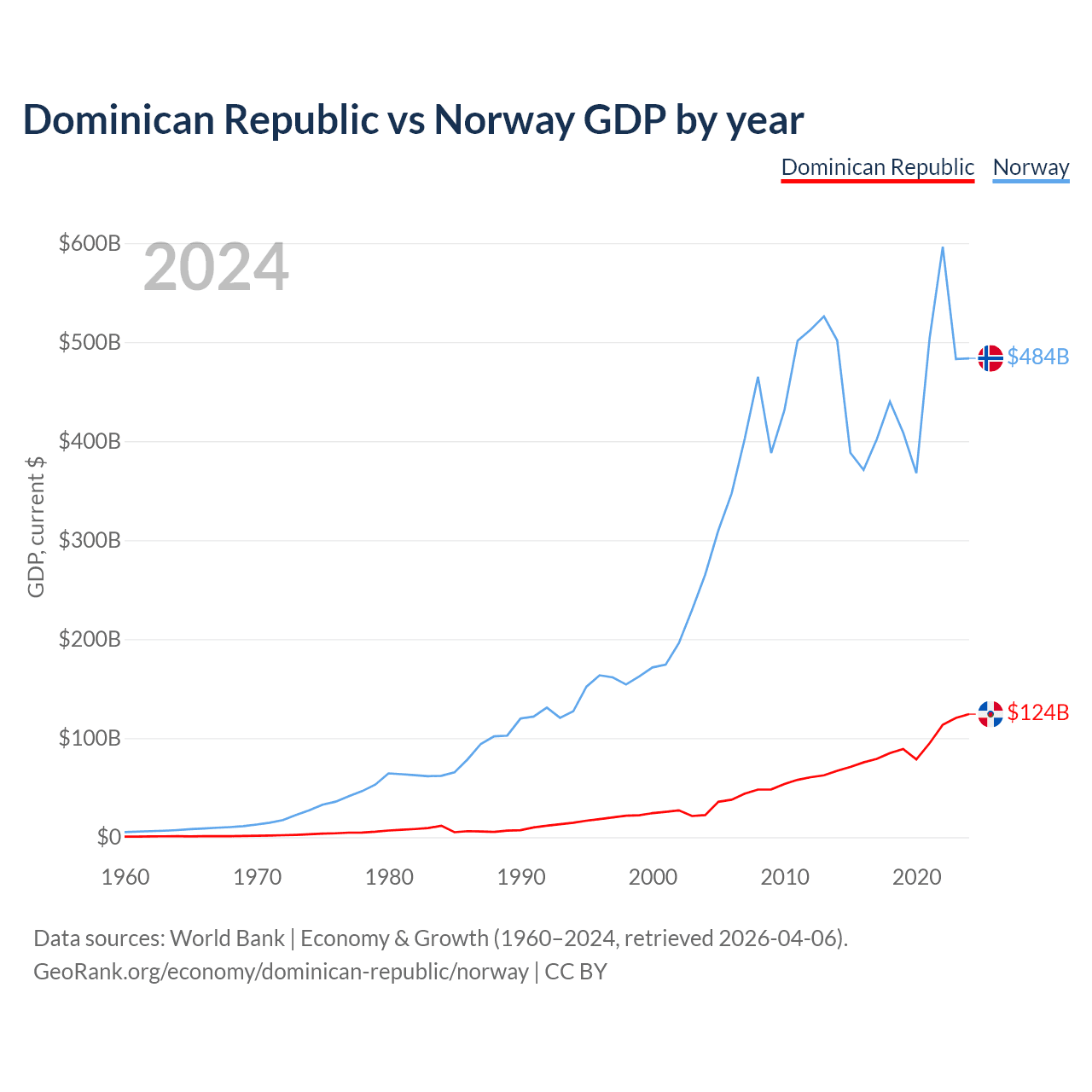 The Dominican Republic has a GDP of $124B compared to $484B for Norway, ranking 63/197 and 32/197 by economy size, respectively.