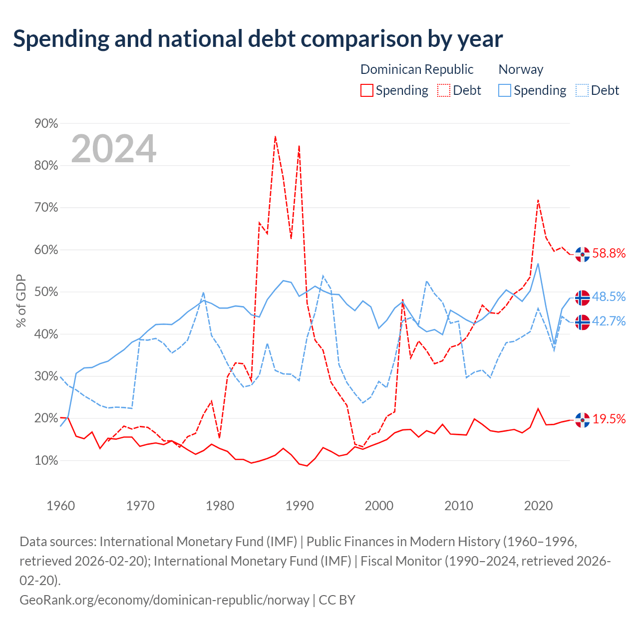 The Dominican Republic has $73.1B in government debt (58.8% of GDP), compared to $207B (42.7% of GDP) in Norway.