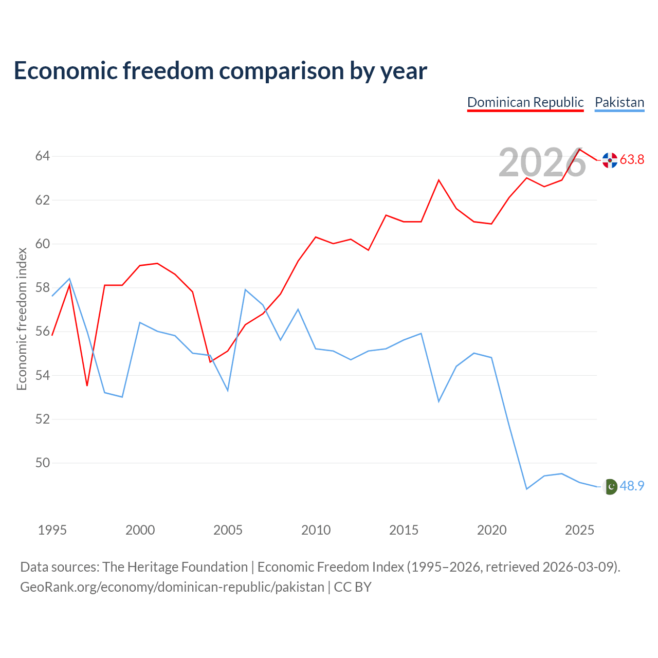 The Economic Freedom Index for the Dominican Republic is 63.8, ranking 77/197, compared to 48.9 for Pakistan, ranking 168/197. The chart above displays a comparison of annual changes in economic freedom indexes.