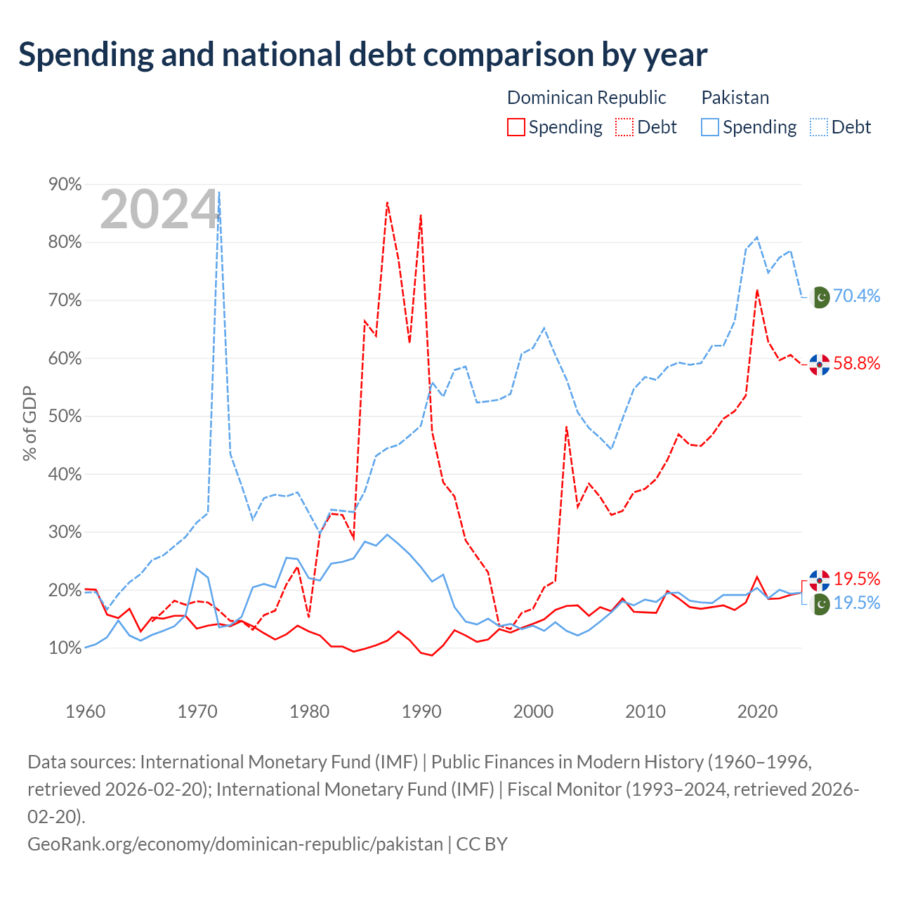 The Dominican Republic has $73.1B in government debt (58.8% of GDP), compared to $262B (70.4% of GDP) in Pakistan.