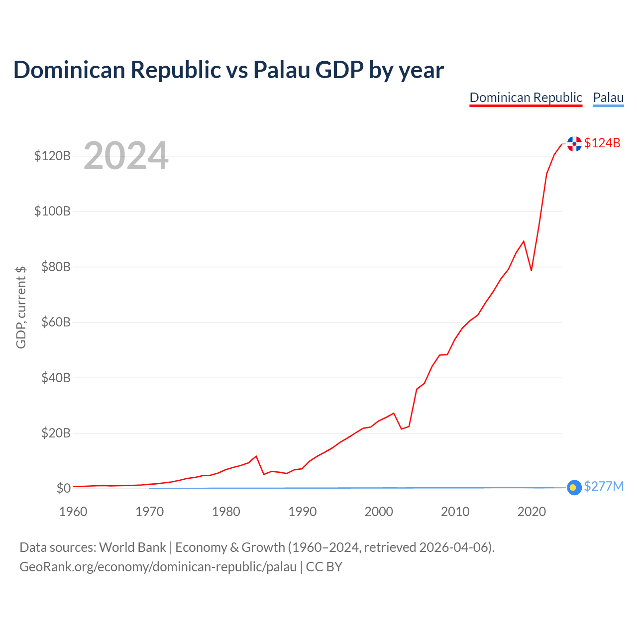 The Dominican Republic has a GDP of $124B compared to $277M for Palau, ranking 63/197 and 194/197 by economy size, respectively.