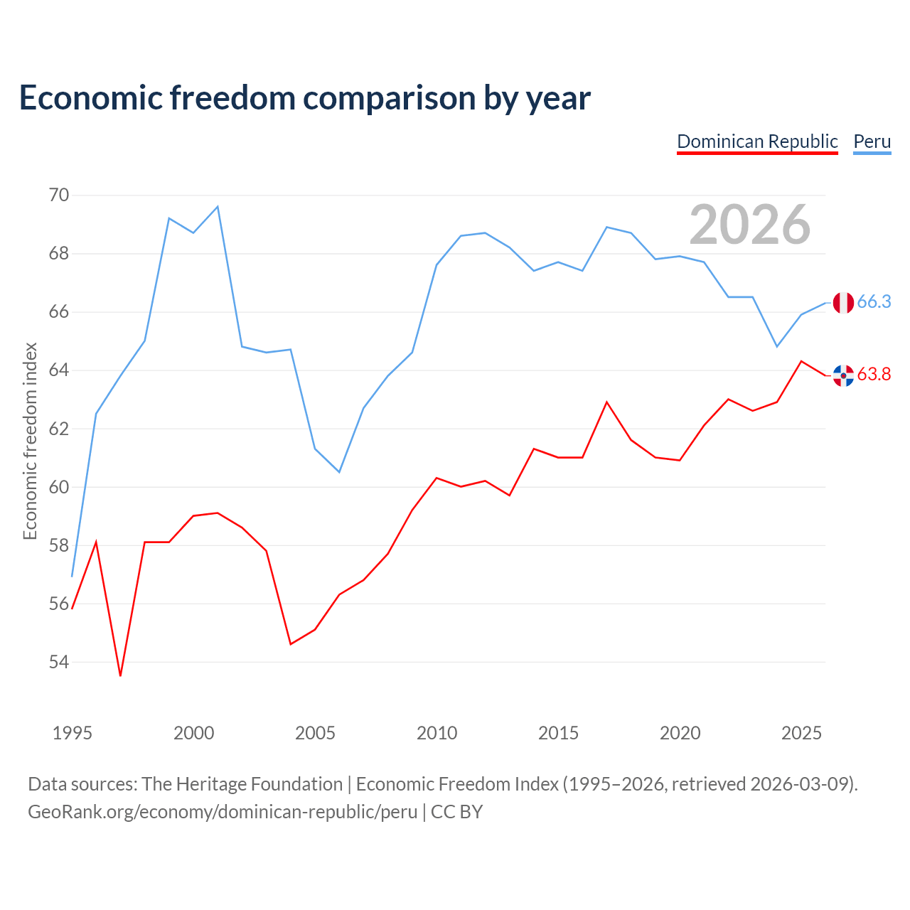 The Economic Freedom Index for the Dominican Republic is 63.8, ranking 77/197, compared to 66.3 for Peru, ranking 62/197. The chart above displays a comparison of annual changes in economic freedom indexes.