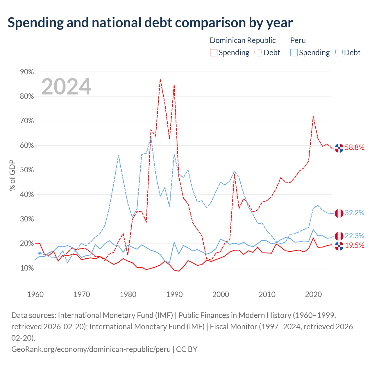 The Dominican Republic has $73.1B in government debt (58.8% of GDP), compared to $93B (32.2% of GDP) in Peru.