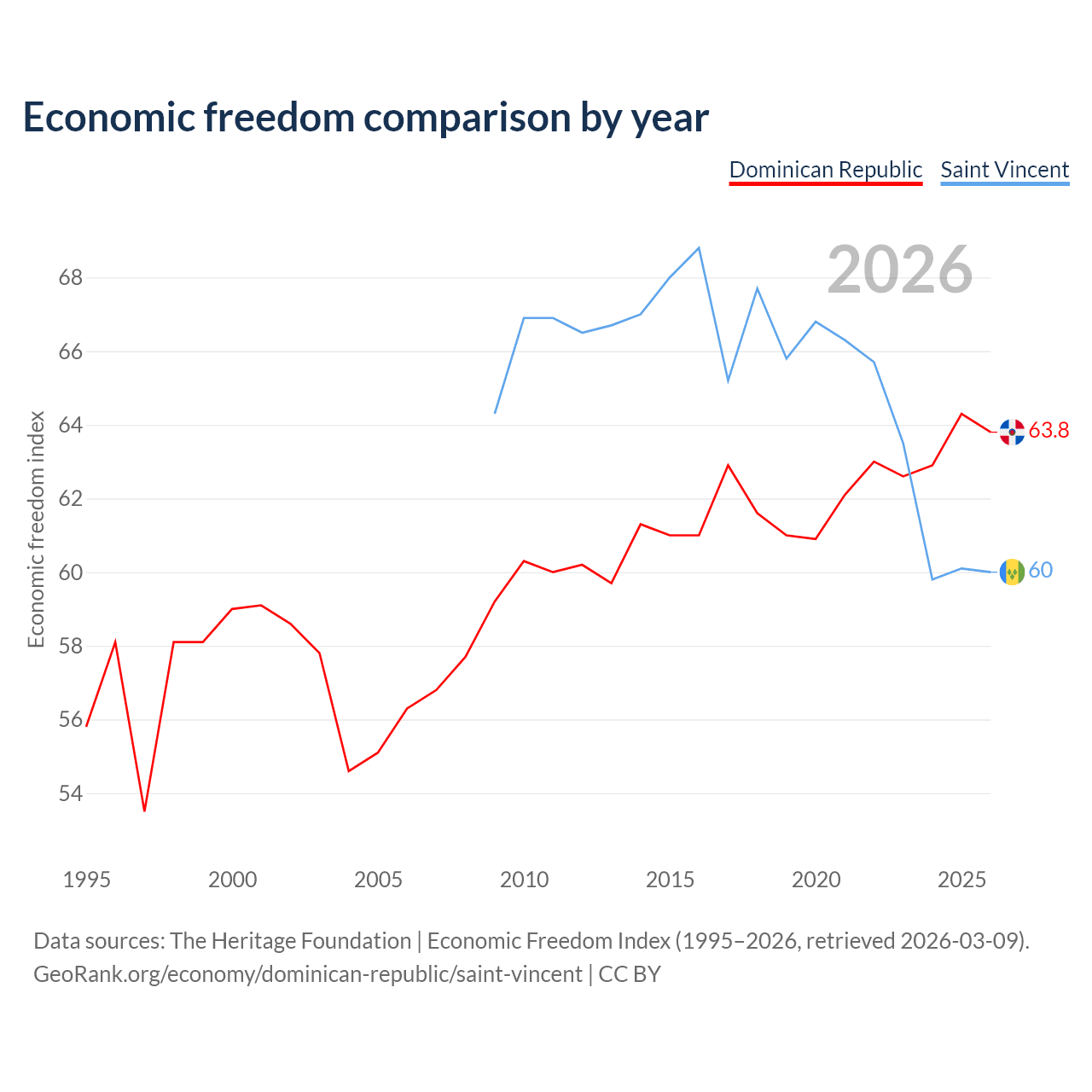 The Economic Freedom Index for the Dominican Republic is 63.8, ranking 77/197, compared to 60 for Saint Vincent, ranking 98/197. The chart above displays a comparison of annual changes in economic freedom indexes.