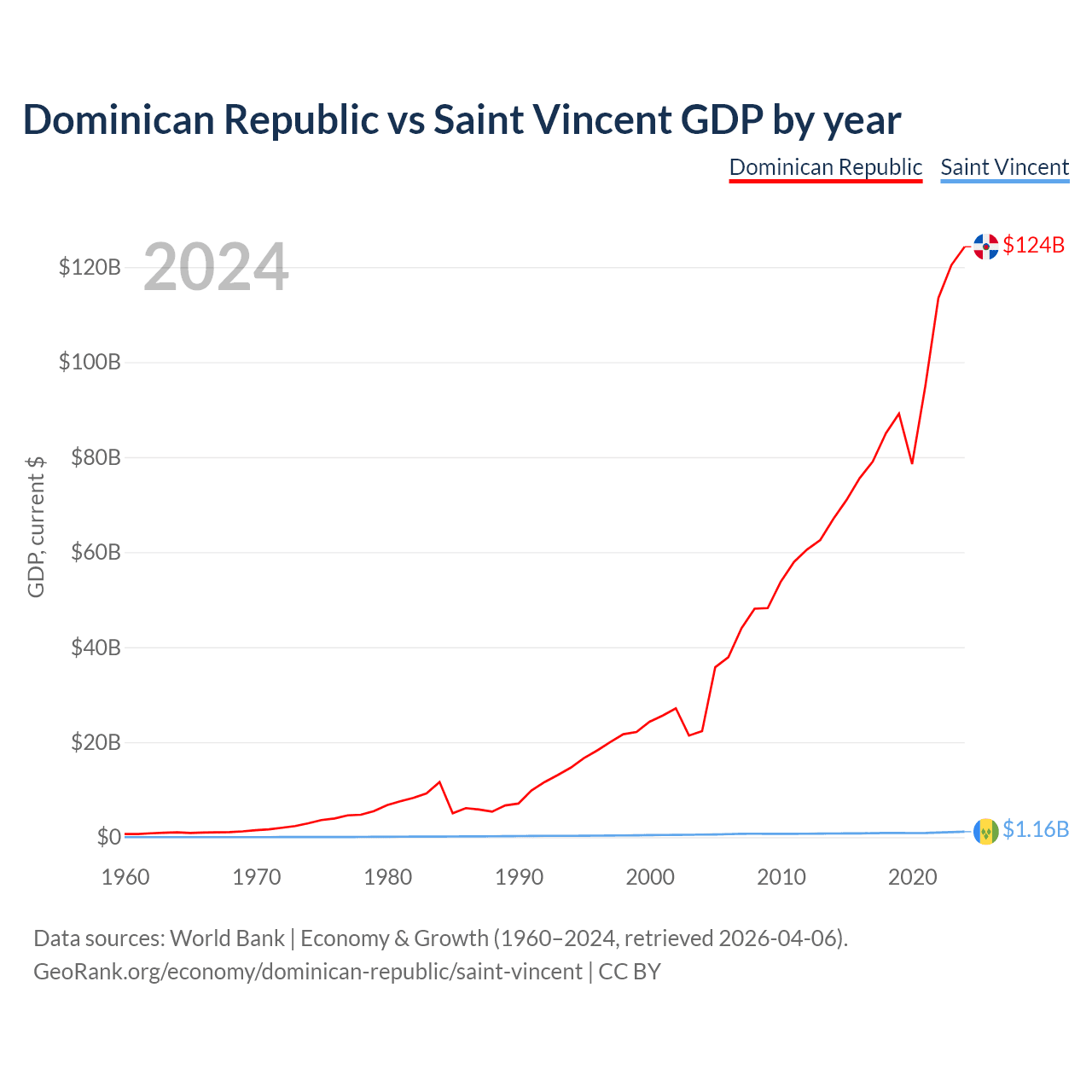 The Dominican Republic has a GDP of $124B compared to $1.16B for Saint Vincent, ranking 63/197 and 186/197 by economy size, respectively.