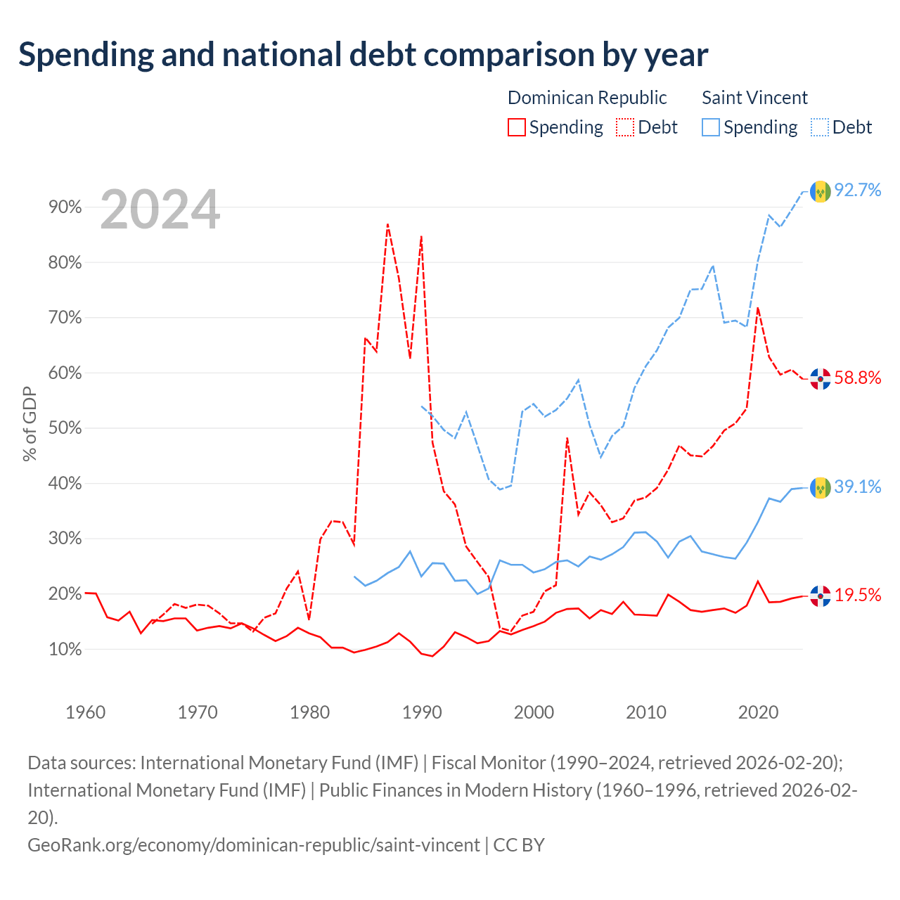 The Dominican Republic has $73.1B in government debt (58.8% of GDP), compared to $1.07B (92.7% of GDP) in Saint Vincent.