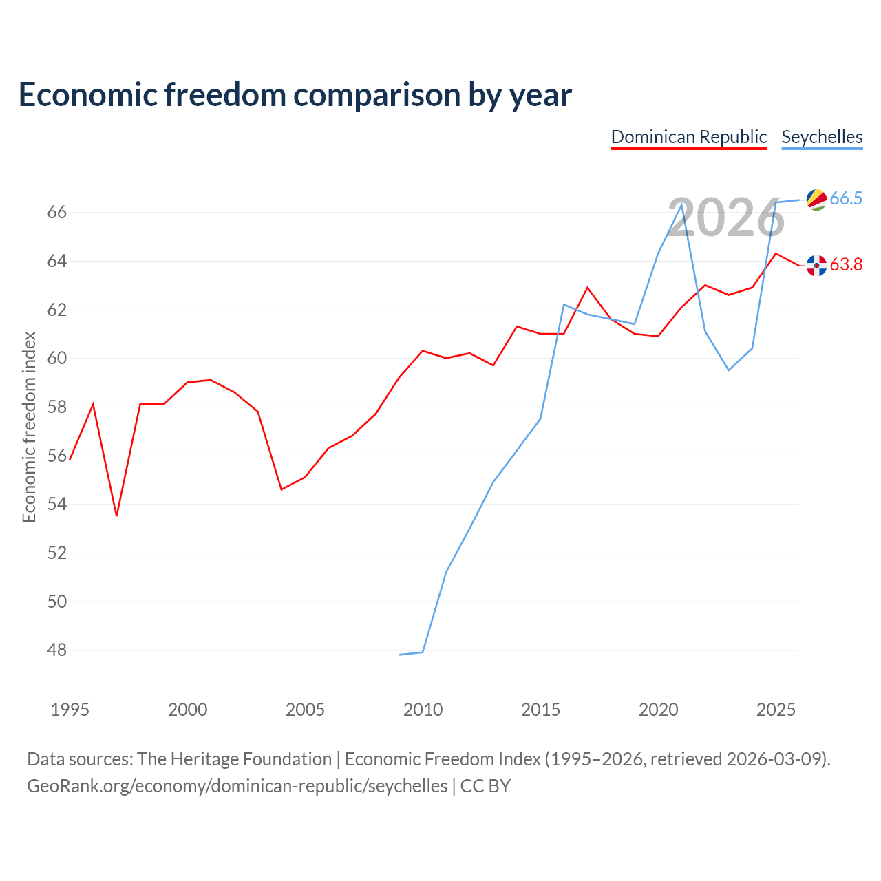 The Economic Freedom Index for the Dominican Republic is 63.8, ranking 77/197, compared to 66.5 for the Seychelles, ranking 60/197. The chart above displays a comparison of annual changes in economic freedom indexes.