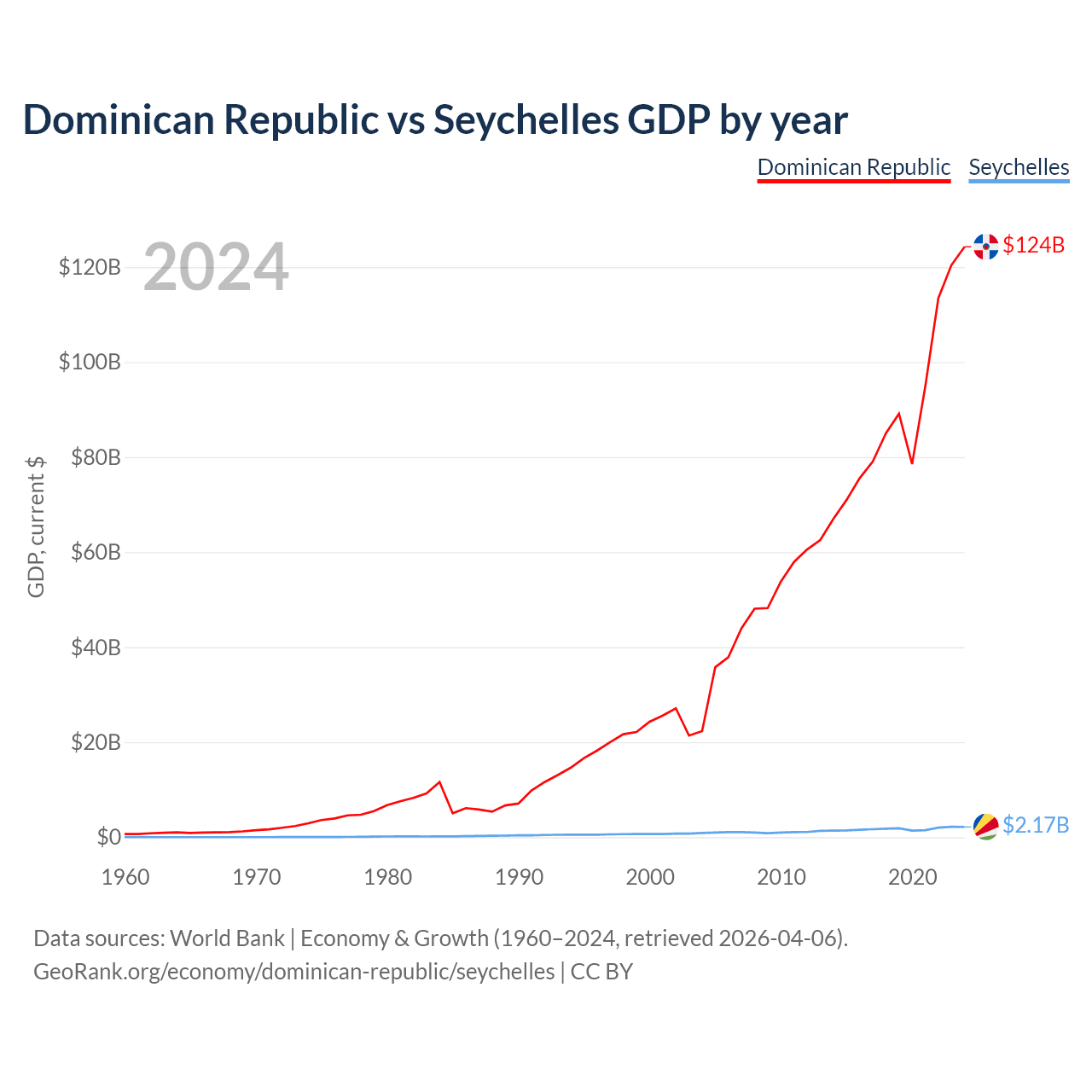 The Dominican Republic has a GDP of $124B compared to $2.17B for the Seychelles, ranking 63/197 and 178/197 by economy size, respectively.