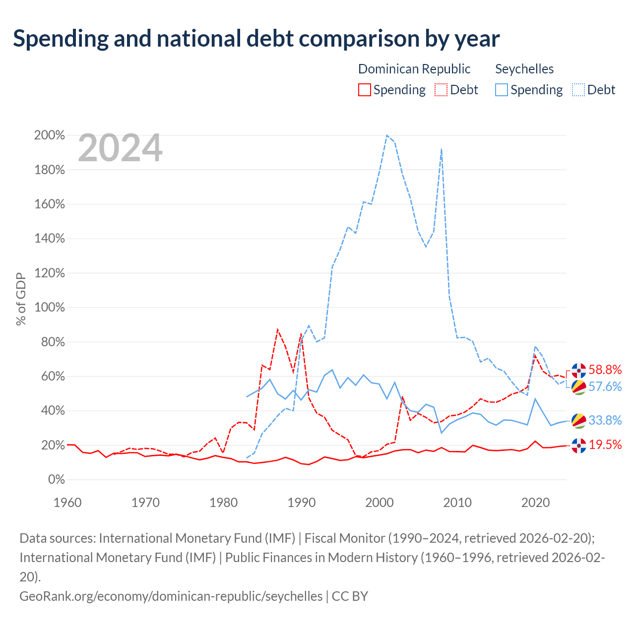 The Dominican Republic has $73.1B in government debt (58.8% of GDP), compared to $1.25B (57.6% of GDP) in the Seychelles.