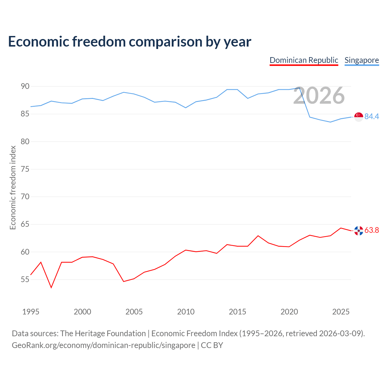 The Economic Freedom Index for the Dominican Republic is 63.8, ranking 77/197, compared to 84.4 for Singapore, ranking 1/197. The chart above displays a comparison of annual changes in economic freedom indexes.