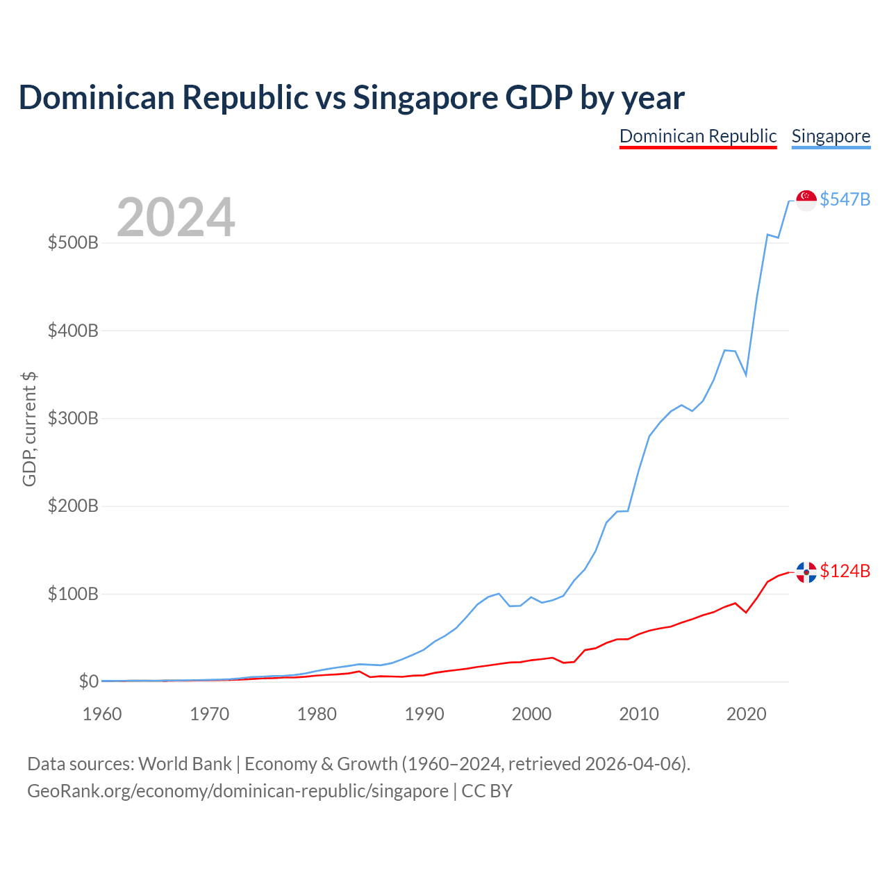 The Dominican Republic has a GDP of $124B compared to $547B for Singapore, ranking 63/197 and 28/197 by economy size, respectively.