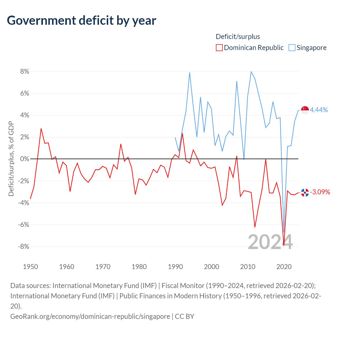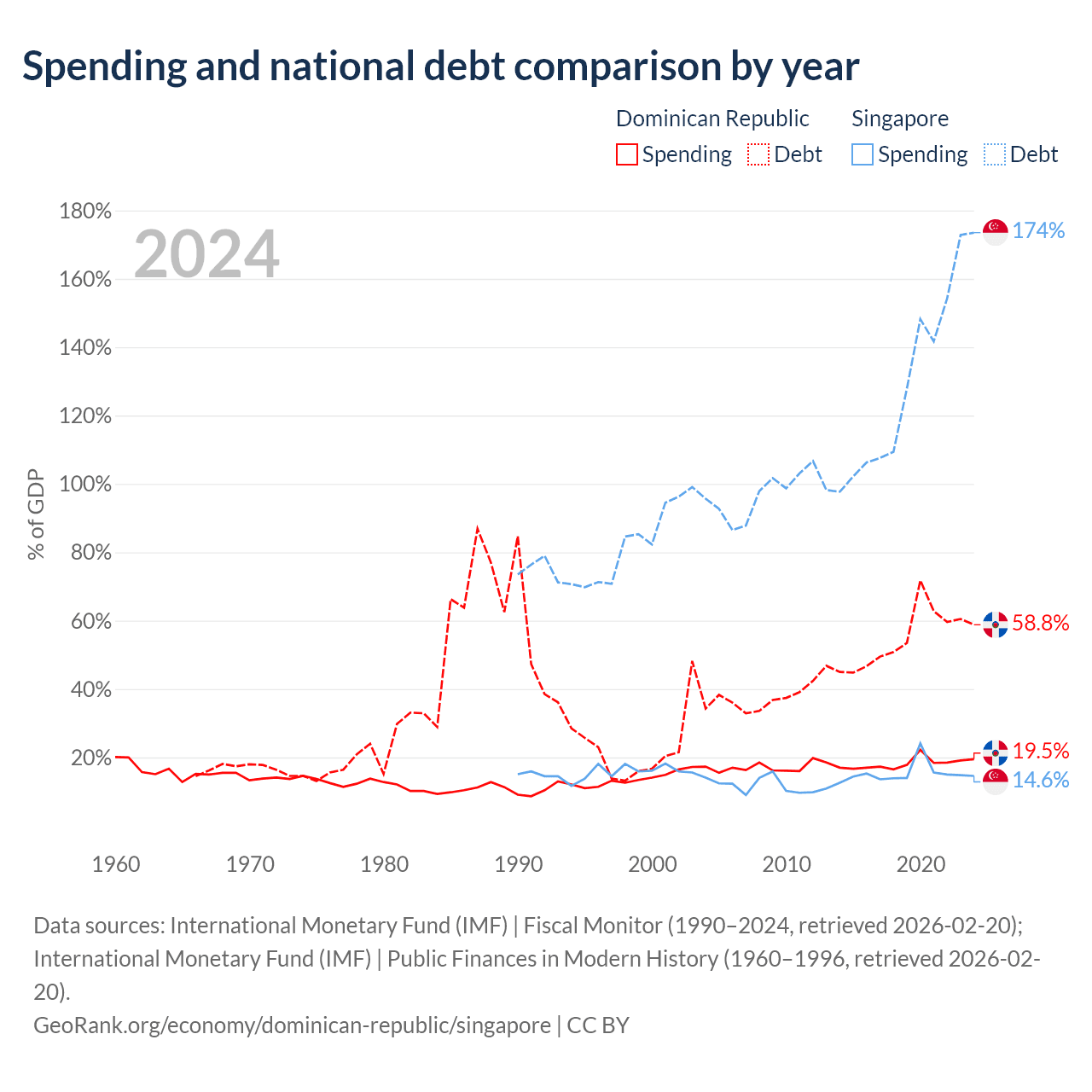 The Dominican Republic has $73.1B in government debt (58.8% of GDP), compared to $950B (173.5% of GDP) in Singapore.