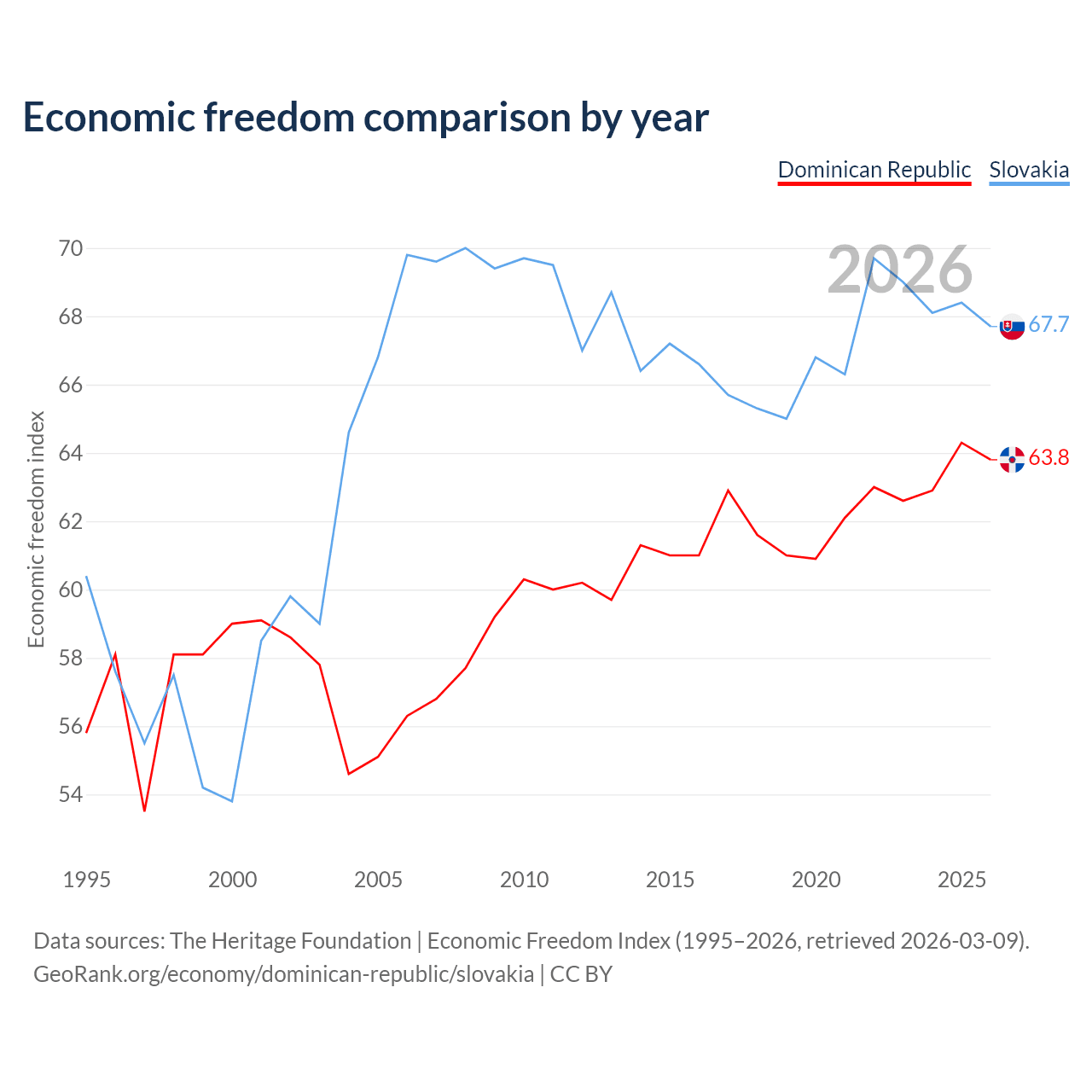 The Economic Freedom Index for the Dominican Republic is 63.8, ranking 77/197, compared to 67.7 for Slovakia, ranking 54/197. The chart above displays a comparison of annual changes in economic freedom indexes.