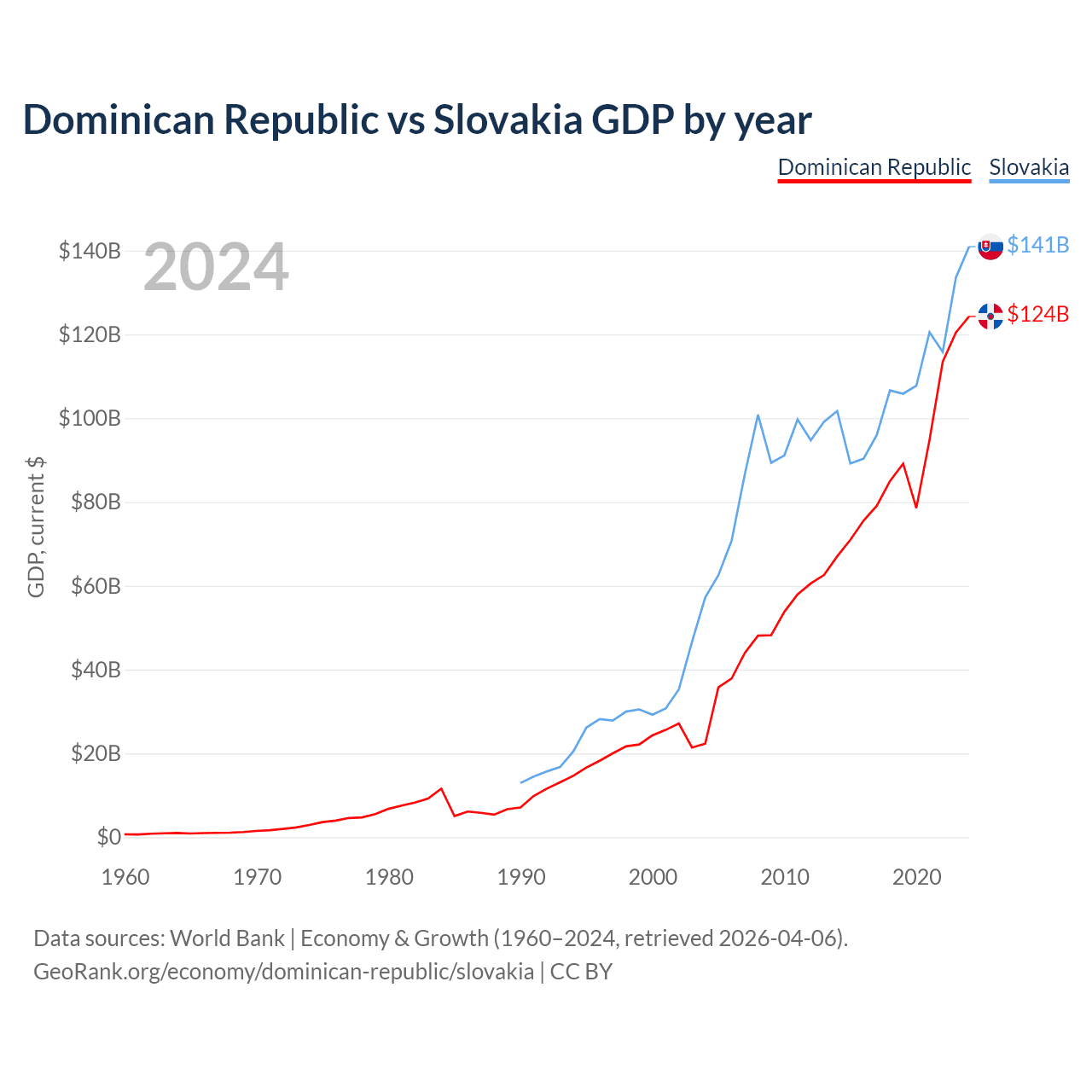 The Dominican Republic has a GDP of $124B compared to $141B for Slovakia, ranking 63/197 and 61/197 by economy size, respectively.