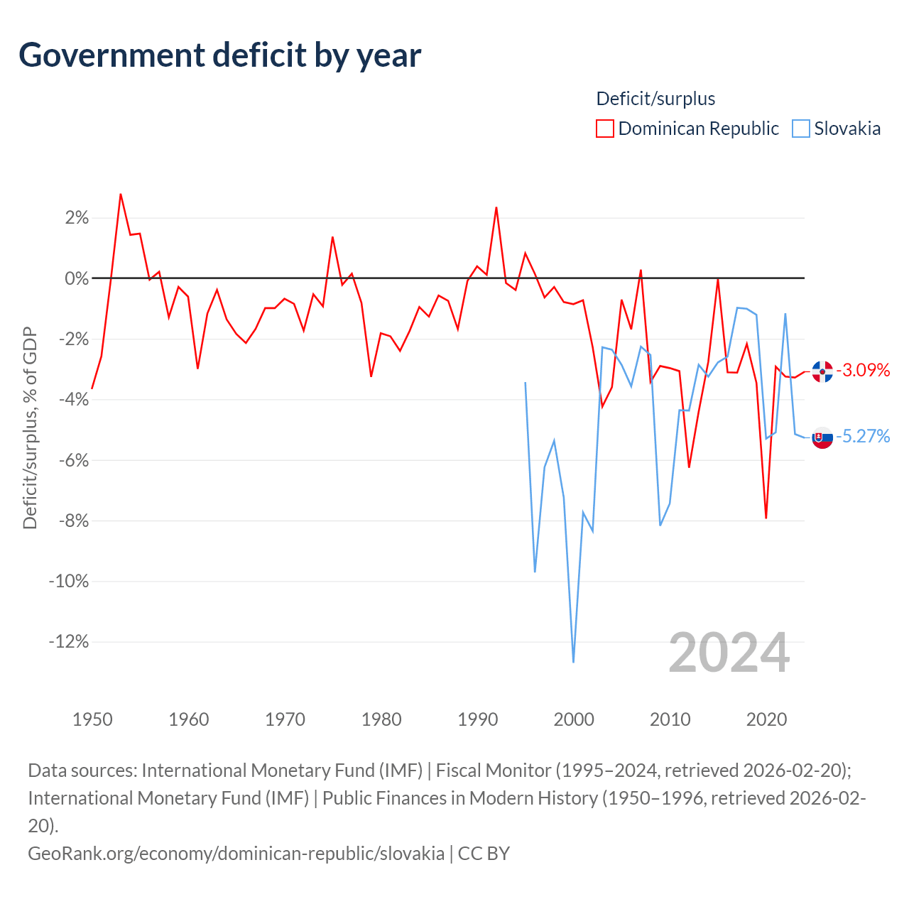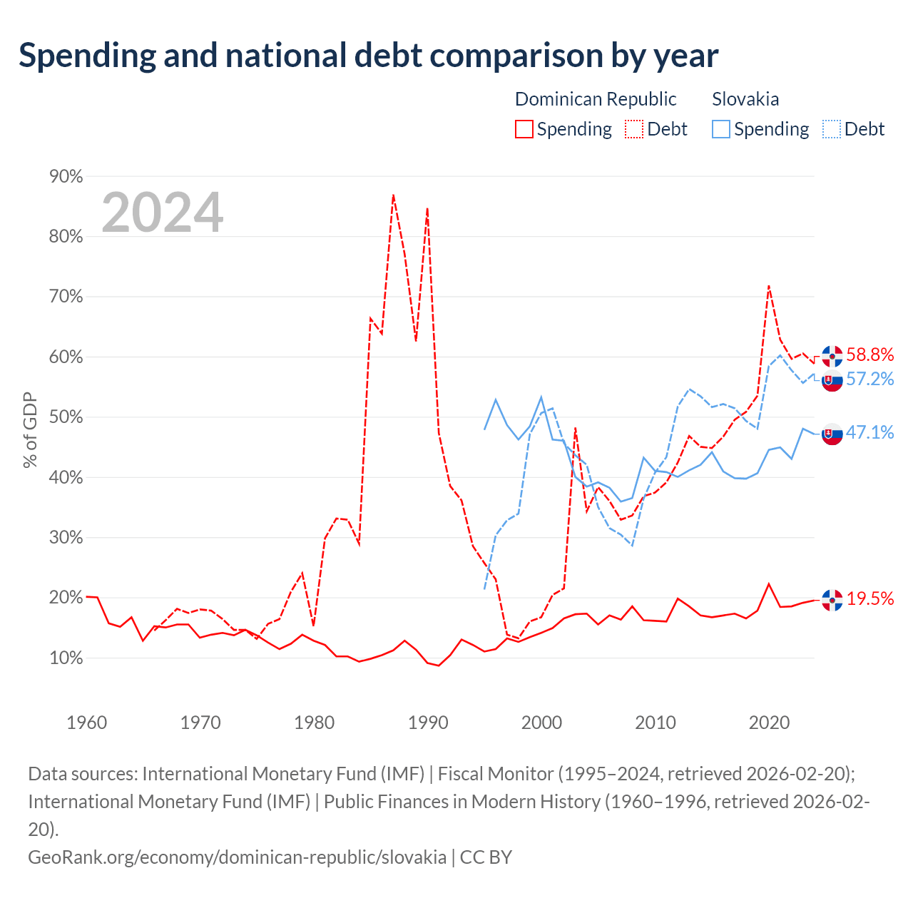 The Dominican Republic has $73.1B in government debt (58.8% of GDP), compared to $80.7B (57.2% of GDP) in Slovakia.