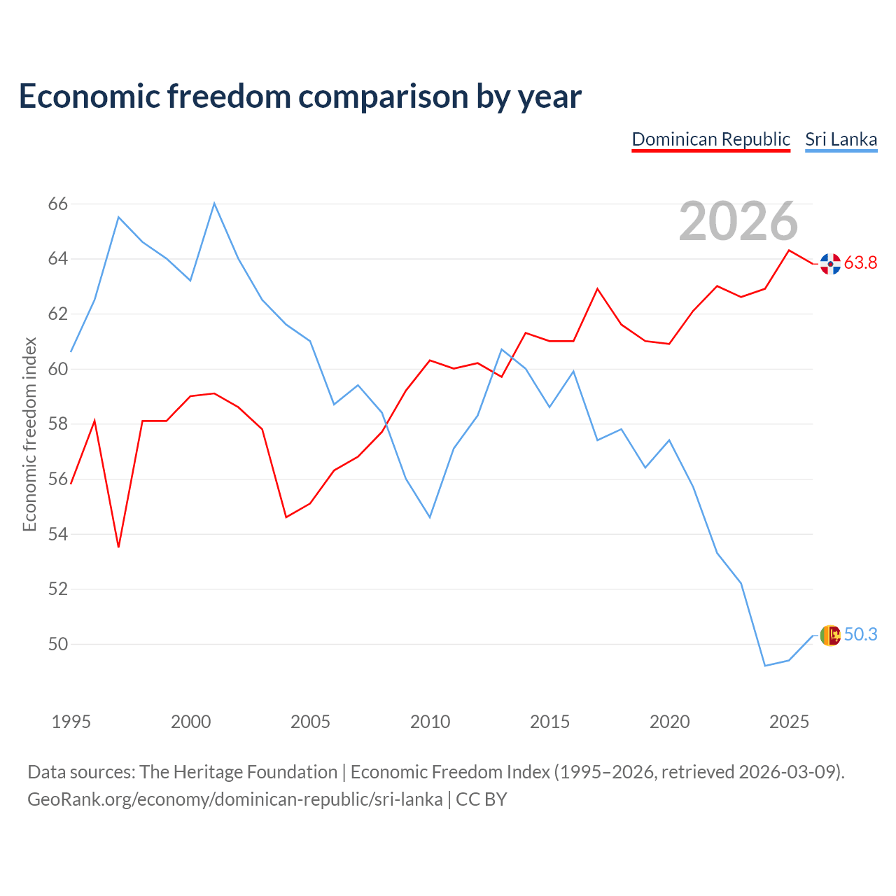 The Economic Freedom Index for the Dominican Republic is 63.8, ranking 77/197, compared to 50.3 for Sri Lanka, ranking 162/197. The chart above displays a comparison of annual changes in economic freedom indexes.