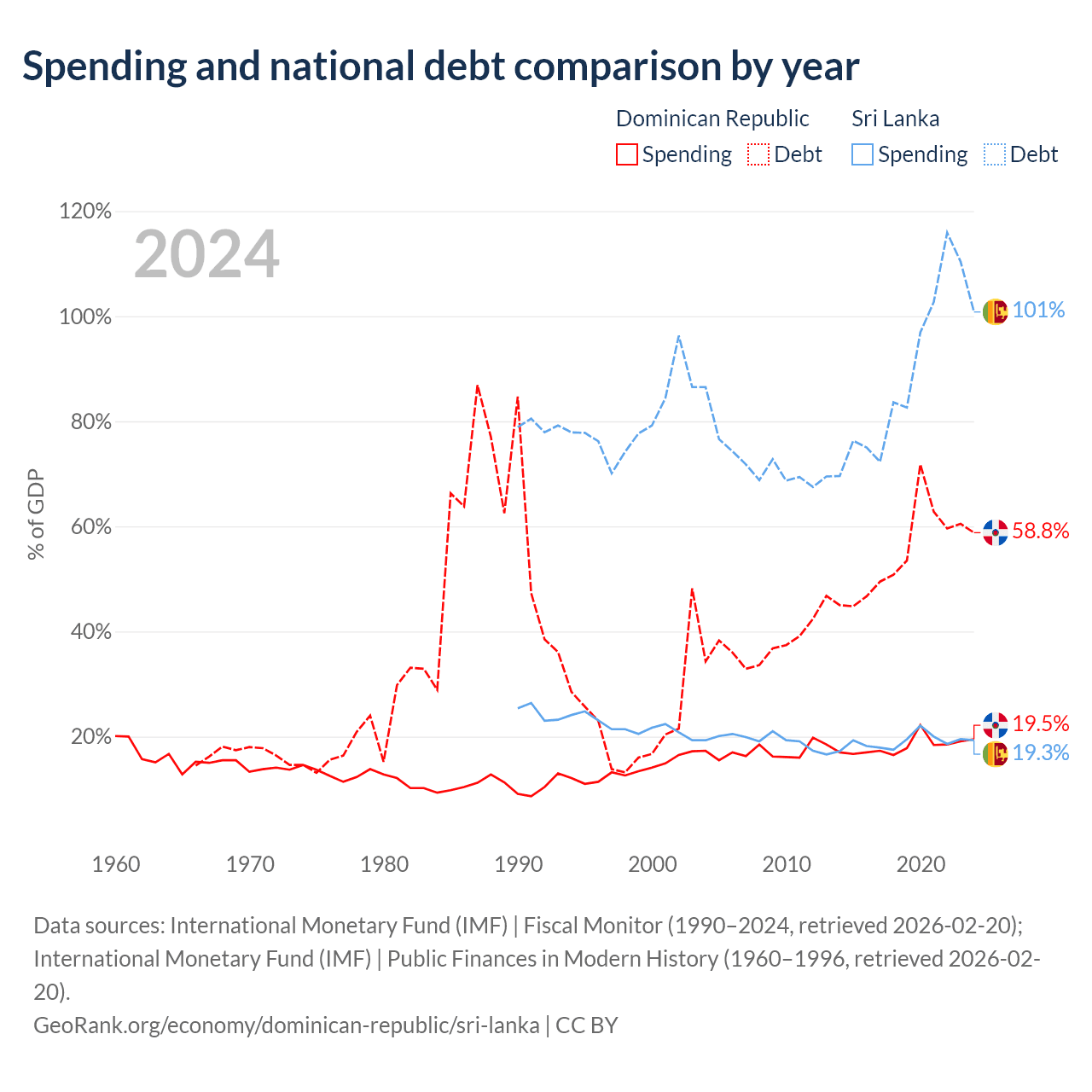 The Dominican Republic has $73.1B in government debt (58.8% of GDP), compared to $99.8B (100.8% of GDP) in Sri Lanka.