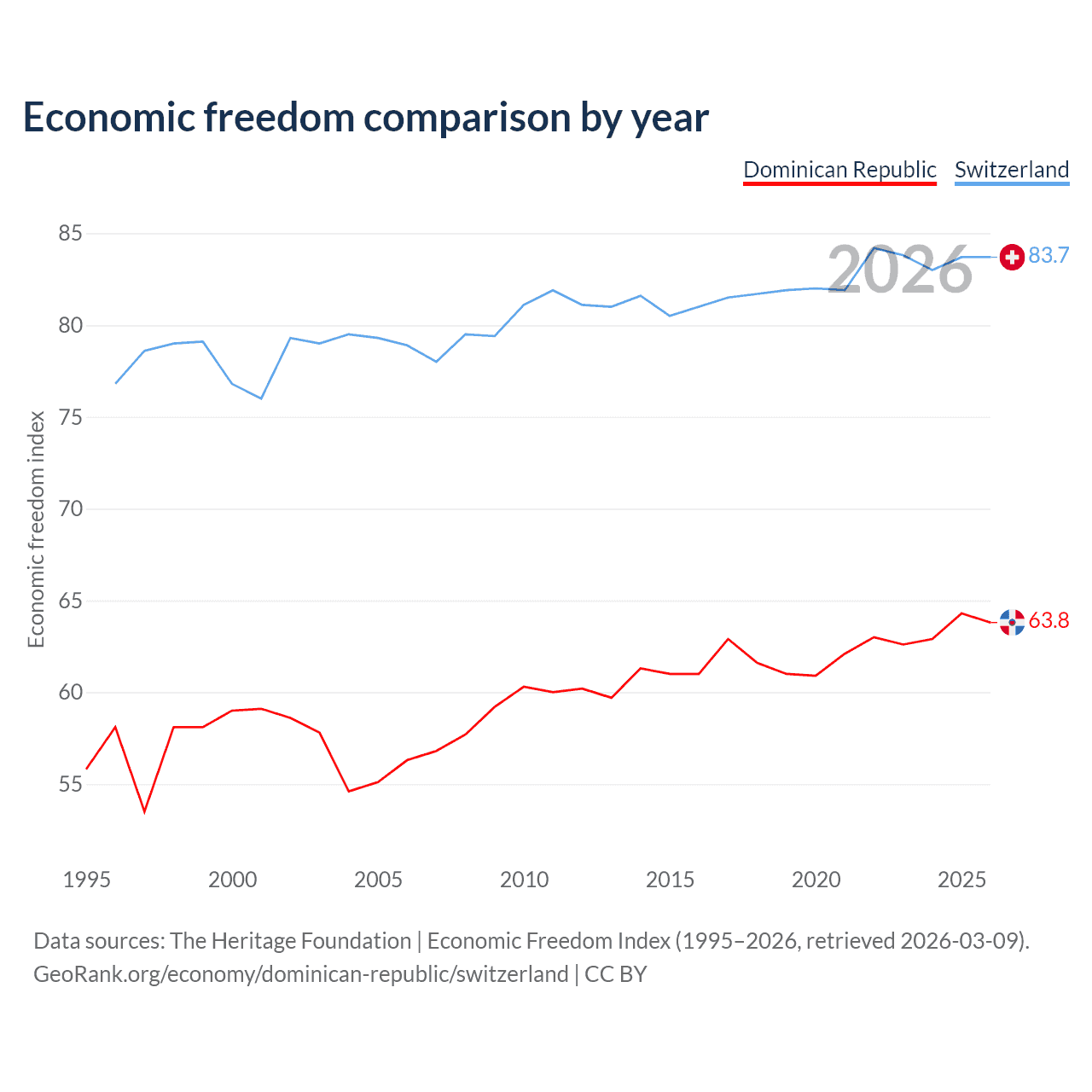 The Economic Freedom Index for the Dominican Republic is 63.8, ranking 77/197, compared to 83.7 for Switzerland, ranking 2/197. The chart above displays a comparison of annual changes in economic freedom indexes.