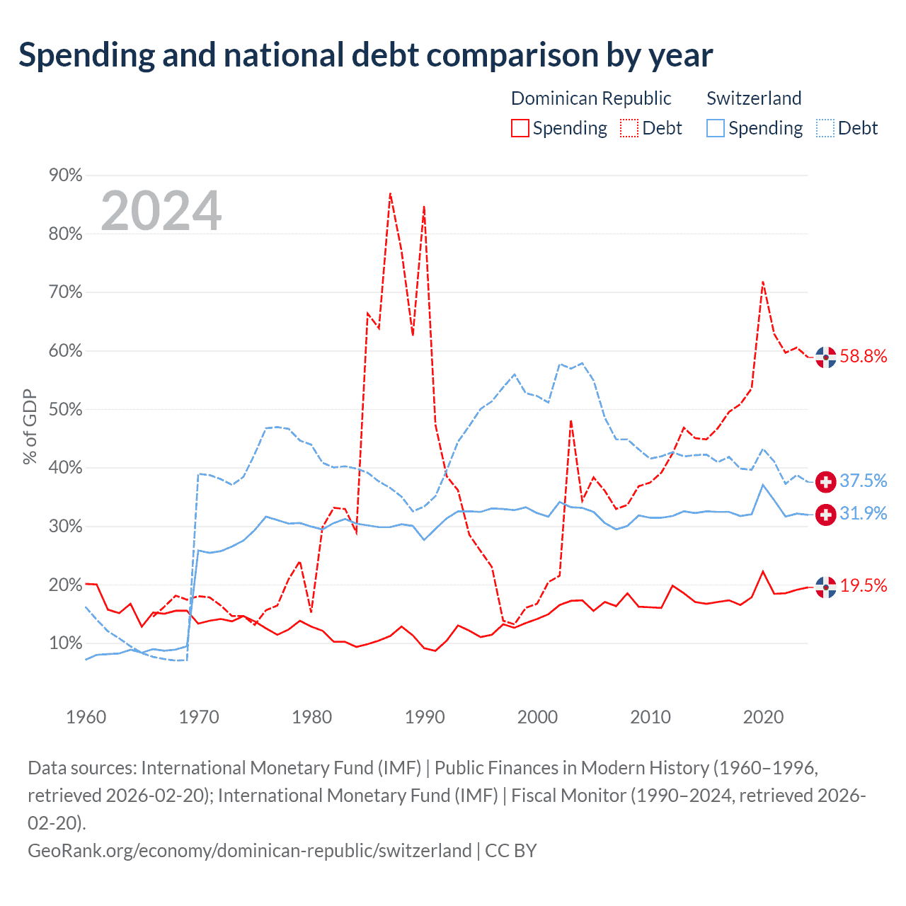 The Dominican Republic has $73.1B in government debt (58.8% of GDP), compared to $351B (37.5% of GDP) in Switzerland.