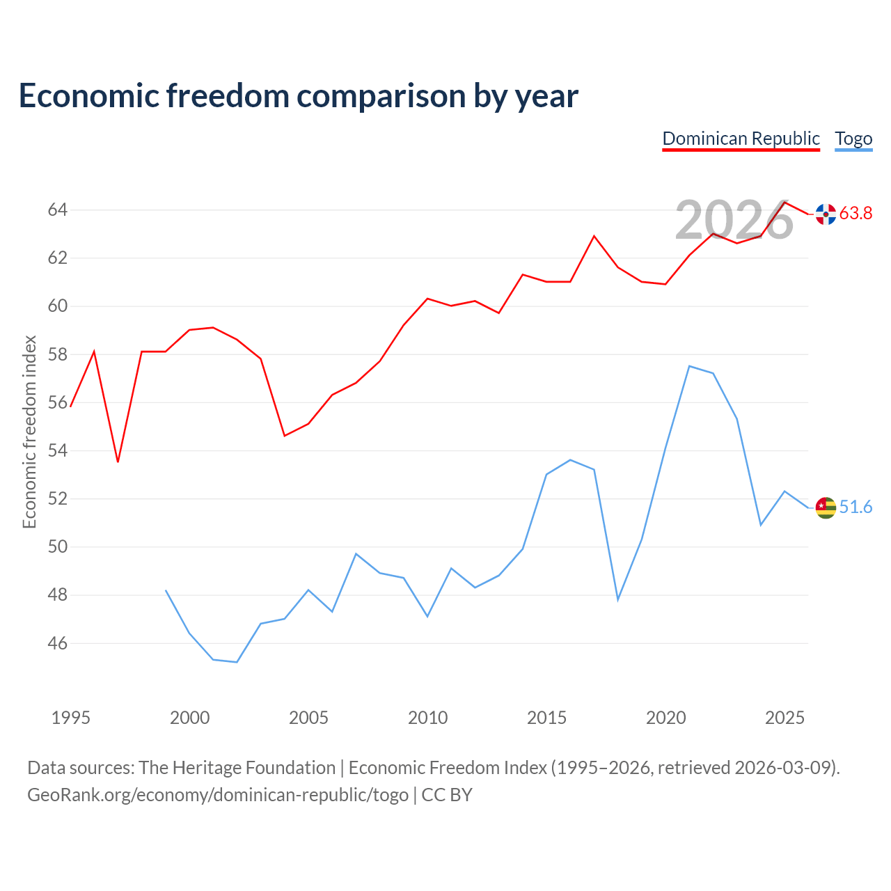 The Economic Freedom Index for the Dominican Republic is 63.8, ranking 77/197, compared to 51.6 for Togo, ranking 153/197. The chart above displays a comparison of annual changes in economic freedom indexes.