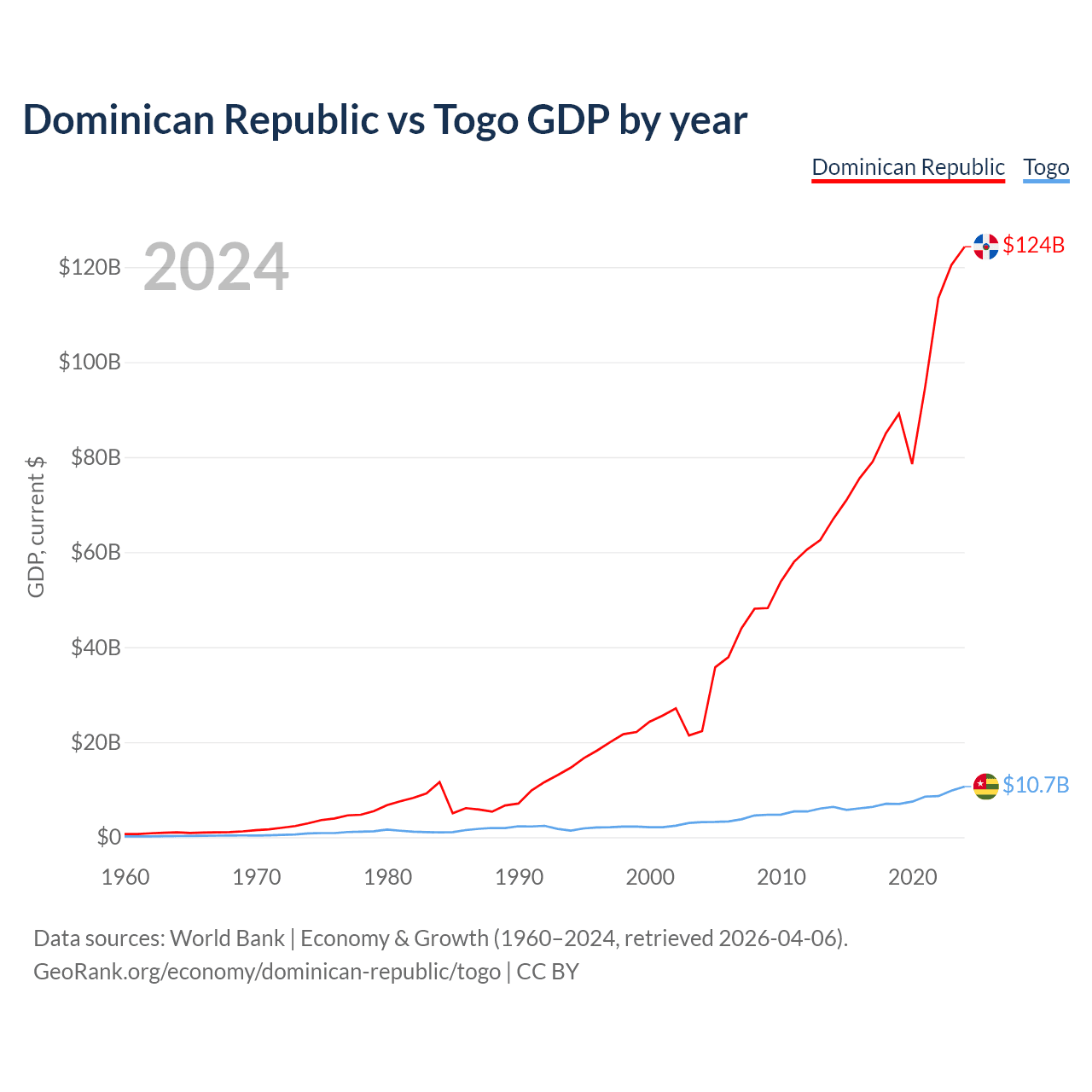 The Dominican Republic has a GDP of $124B compared to $10.7B for Togo, ranking 63/197 and 154/197 by economy size, respectively.