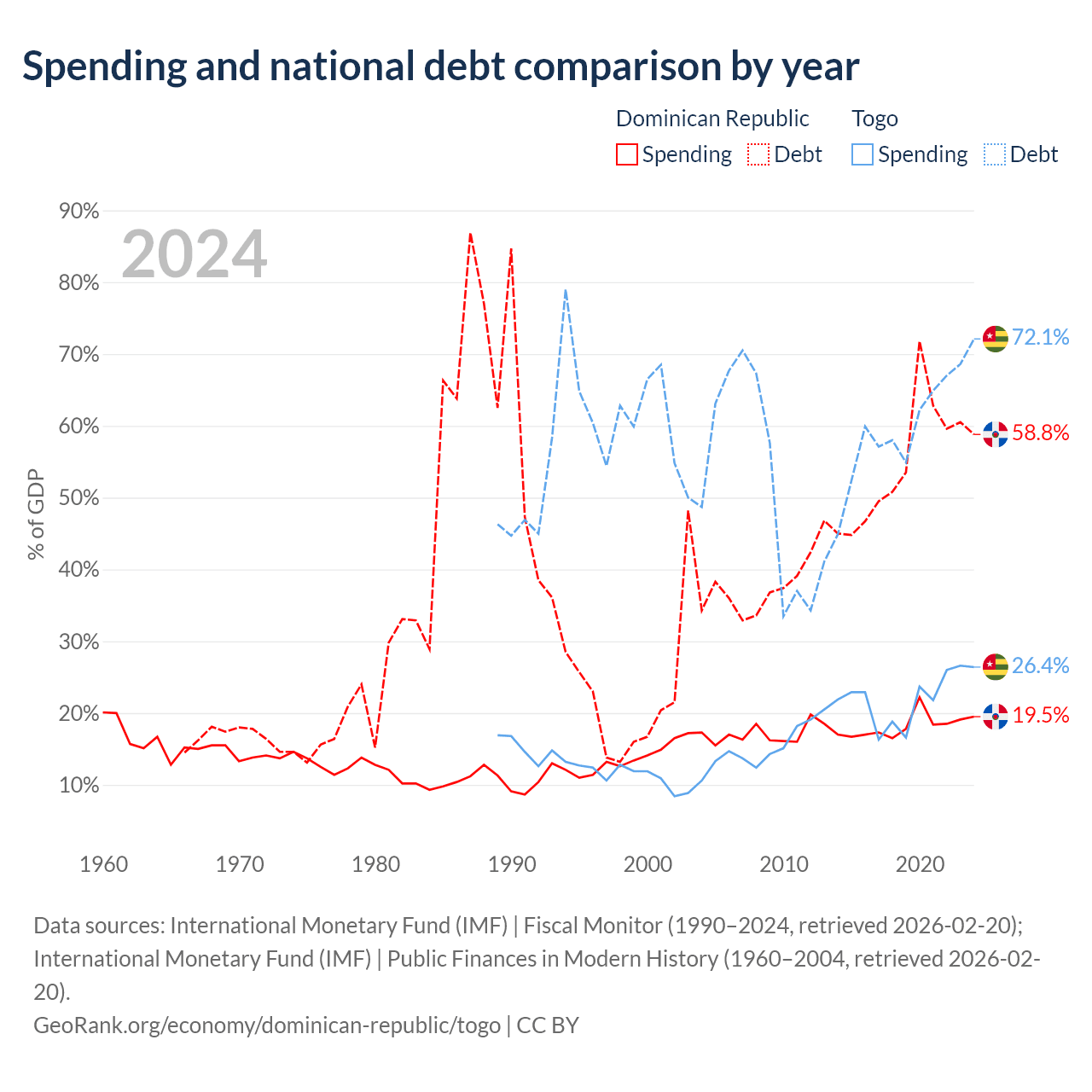 The Dominican Republic has $73.1B in government debt (58.8% of GDP), compared to $7.68B (72.1% of GDP) in Togo.