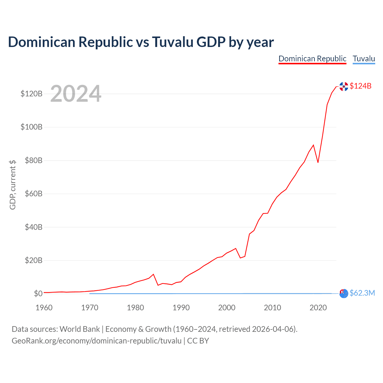 The Dominican Republic has a GDP of $124B compared to $62.3M for Tuvalu, ranking 63/197 and 196/197 by economy size, respectively.