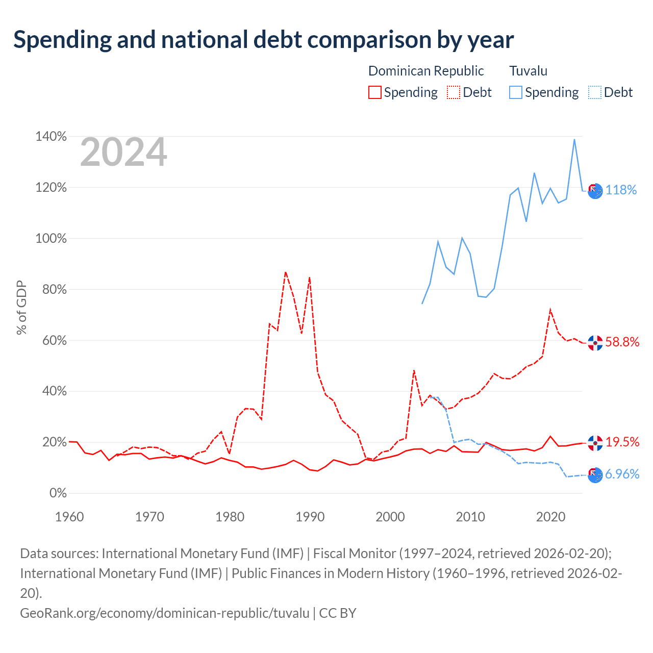 The Dominican Republic has $73.1B in government debt (58.8% of GDP), compared to $4.15M (6.96% of GDP) in Tuvalu.