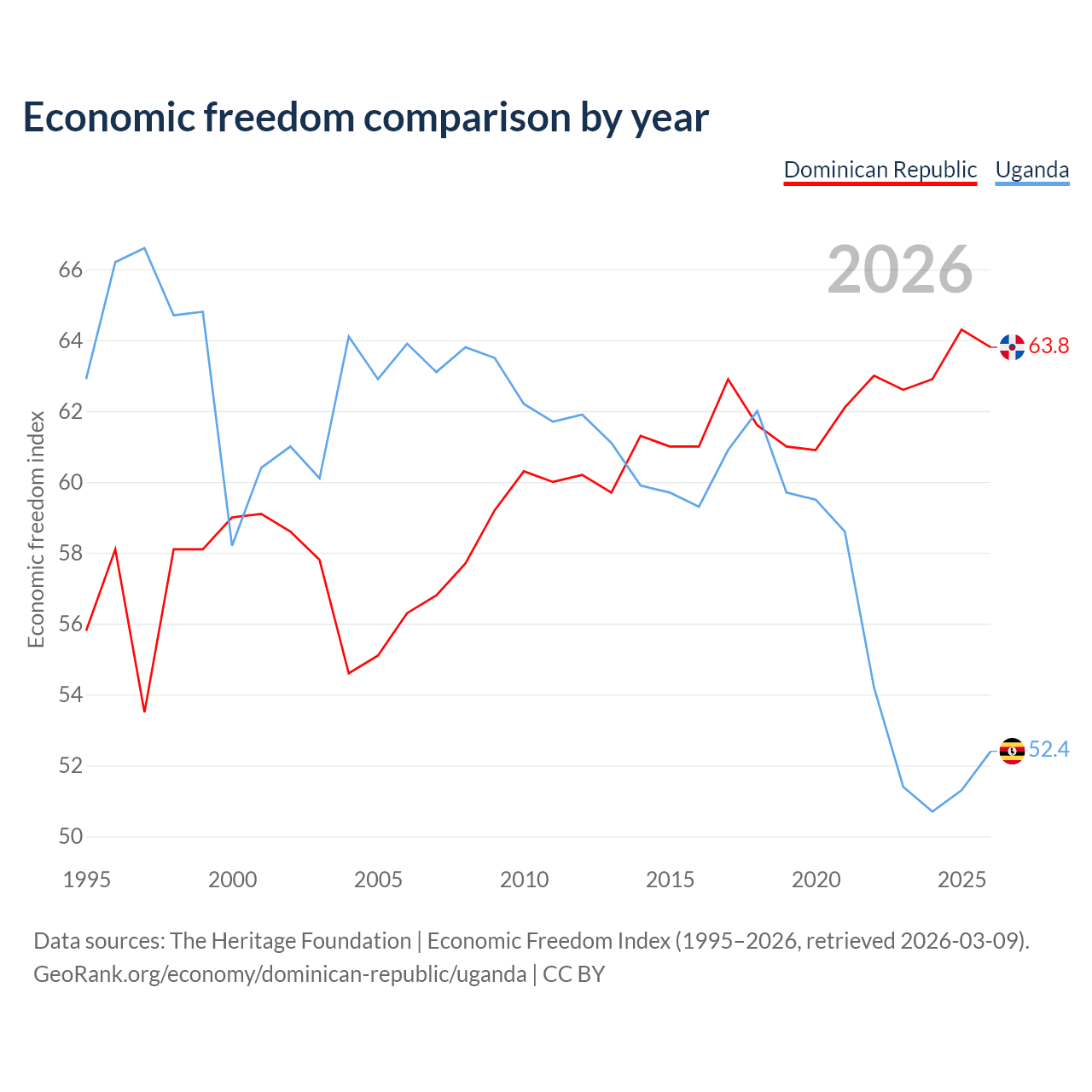 The Economic Freedom Index for the Dominican Republic is 63.8, ranking 77/197, compared to 52.4 for Uganda, ranking 149/197. The chart above displays a comparison of annual changes in economic freedom indexes.