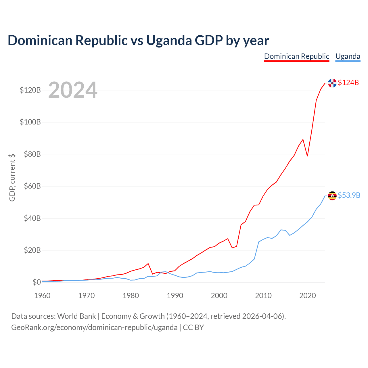 The Dominican Republic has a GDP of $124B compared to $53.9B for Uganda, ranking 63/197 and 89/197 by economy size, respectively.
