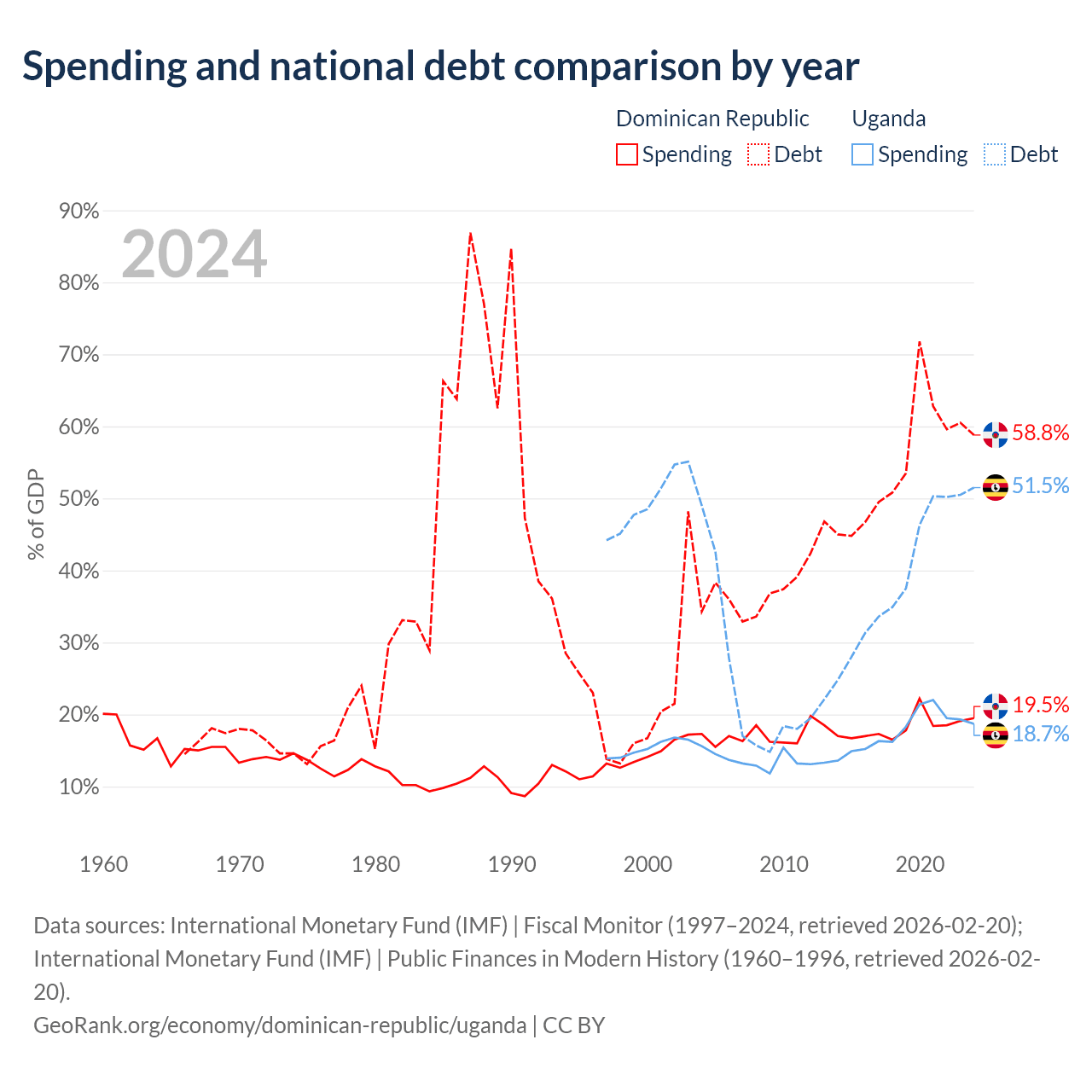 The Dominican Republic has $73.1B in government debt (58.8% of GDP), compared to $27.8B (51.5% of GDP) in Uganda.