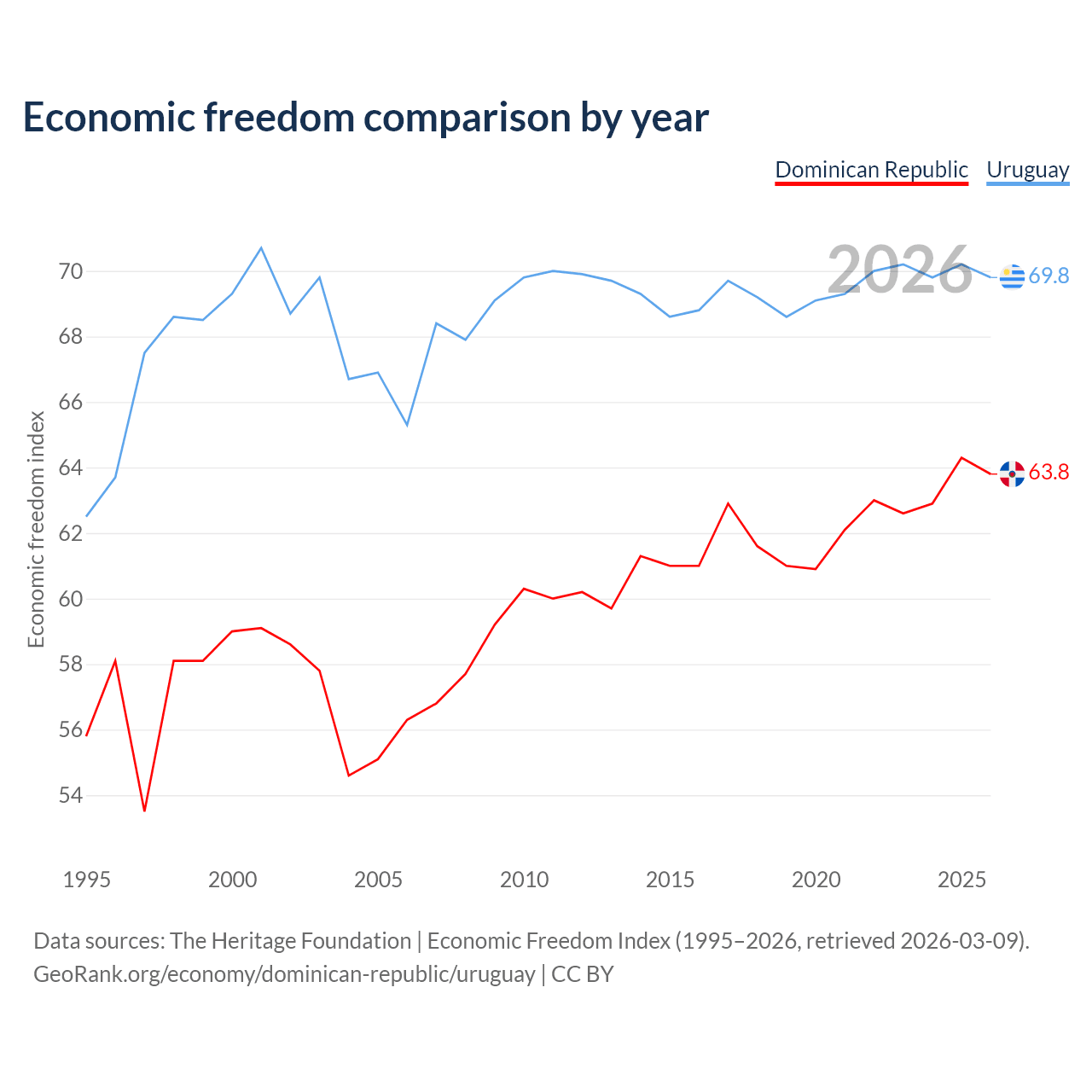 The Economic Freedom Index for the Dominican Republic is 63.8, ranking 77/197, compared to 69.8 for Uruguay, ranking 39/197. The chart above displays a comparison of annual changes in economic freedom indexes.