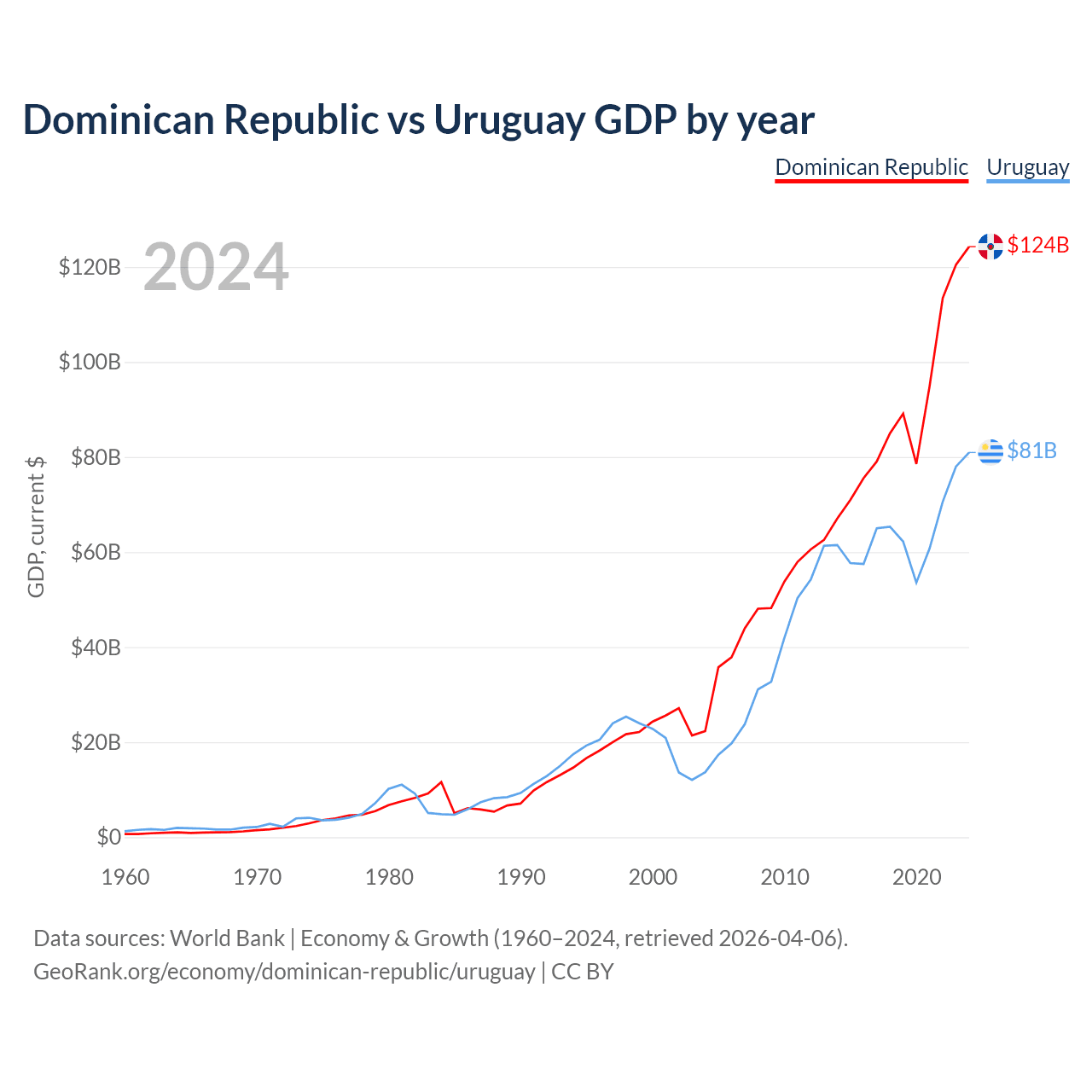 The Dominican Republic has a GDP of $124B compared to $81B for Uruguay, ranking 63/197 and 81/197 by economy size, respectively.