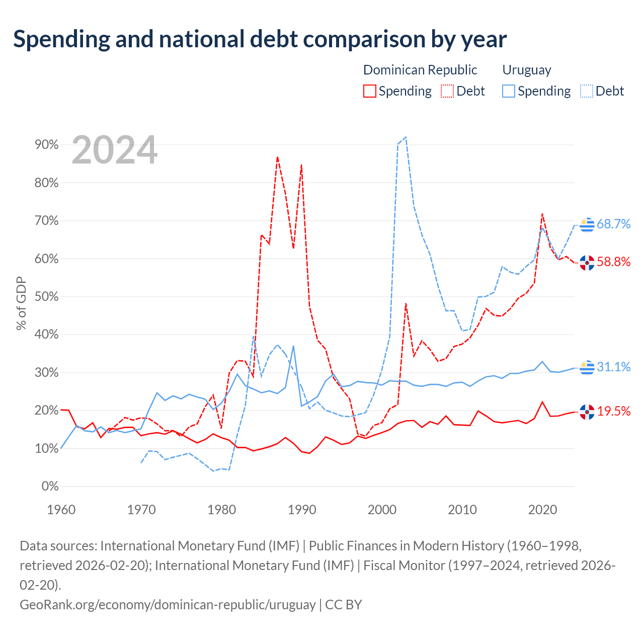 The Dominican Republic has $73.1B in government debt (58.8% of GDP), compared to $55.6B (68.7% of GDP) in Uruguay.