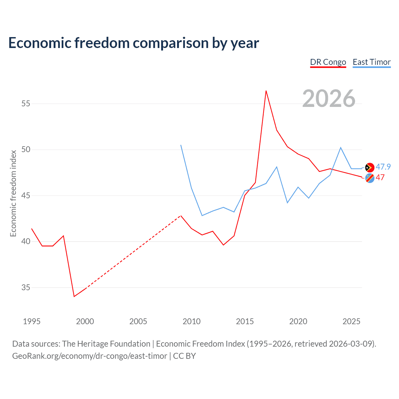 The Economic Freedom Index for the DR Congo is 47, ranking 176/197, compared to 47.9 for East Timor, ranking 173/197. The chart above displays a comparison of annual changes in economic freedom indexes.