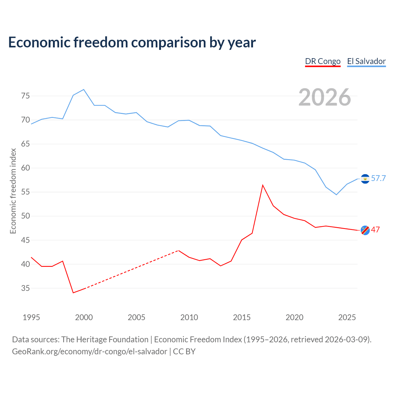 The Economic Freedom Index for the DR Congo is 47, ranking 176/197, compared to 57.7 for El Salvador, ranking 114/197. The chart above displays a comparison of annual changes in economic freedom indexes.