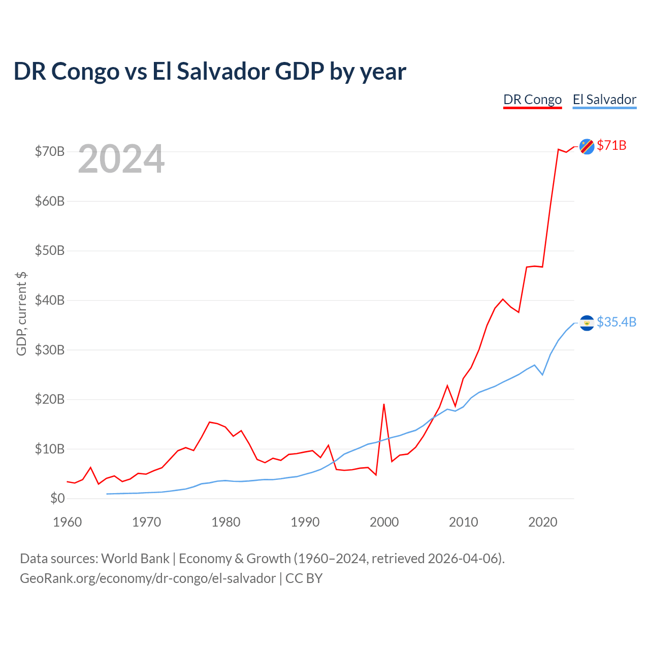 The DR Congo has a GDP of $71B compared to $35.4B for El Salvador, ranking 87/197 and 105/197 by economy size, respectively.