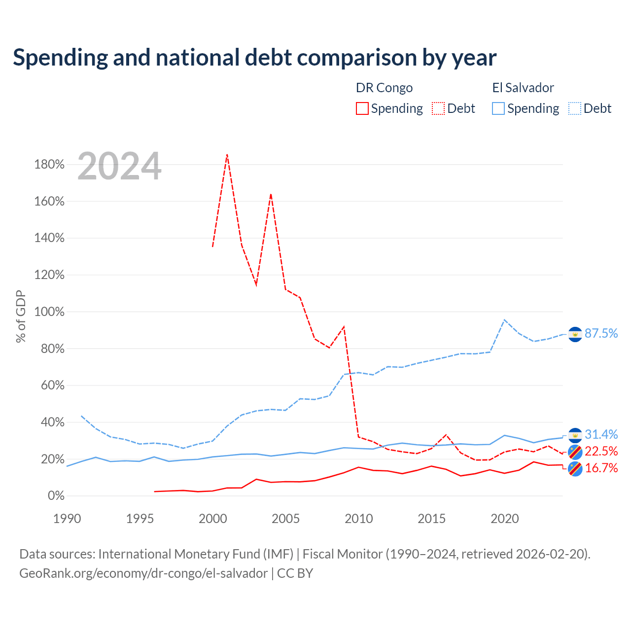 The DR Congo has $16B in government debt (22.5% of GDP), compared to $30.9B (87.5% of GDP) in El Salvador.