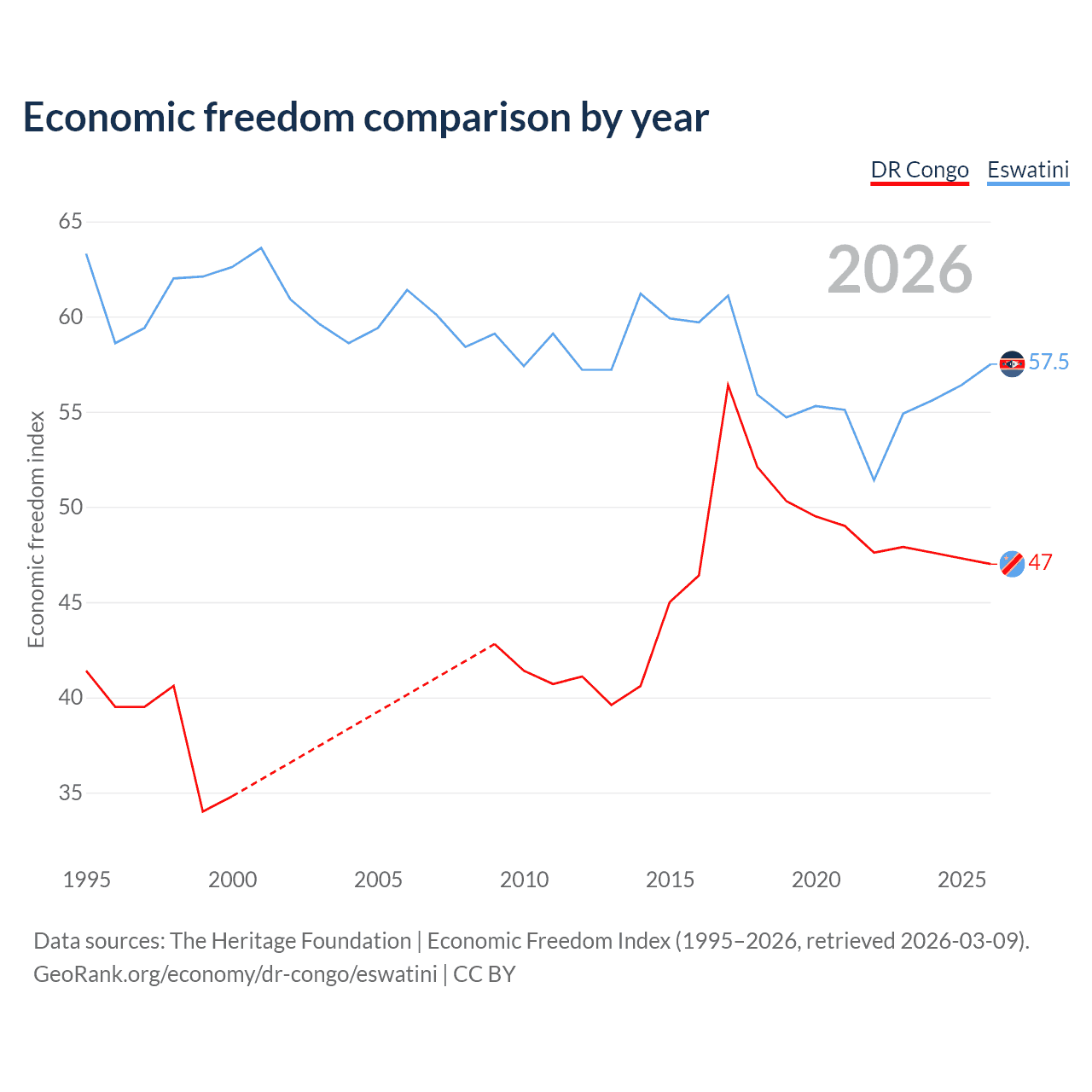 The Economic Freedom Index for the DR Congo is 47, ranking 176/197, compared to 57.5 for Eswatini, ranking 116/197. The chart above displays a comparison of annual changes in economic freedom indexes.