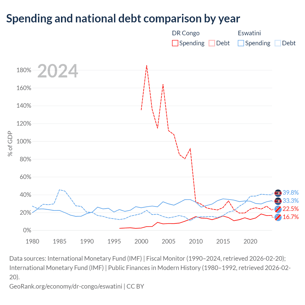 The DR Congo has $16B in government debt (22.5% of GDP), compared to $1.93B (39.8% of GDP) in Eswatini.