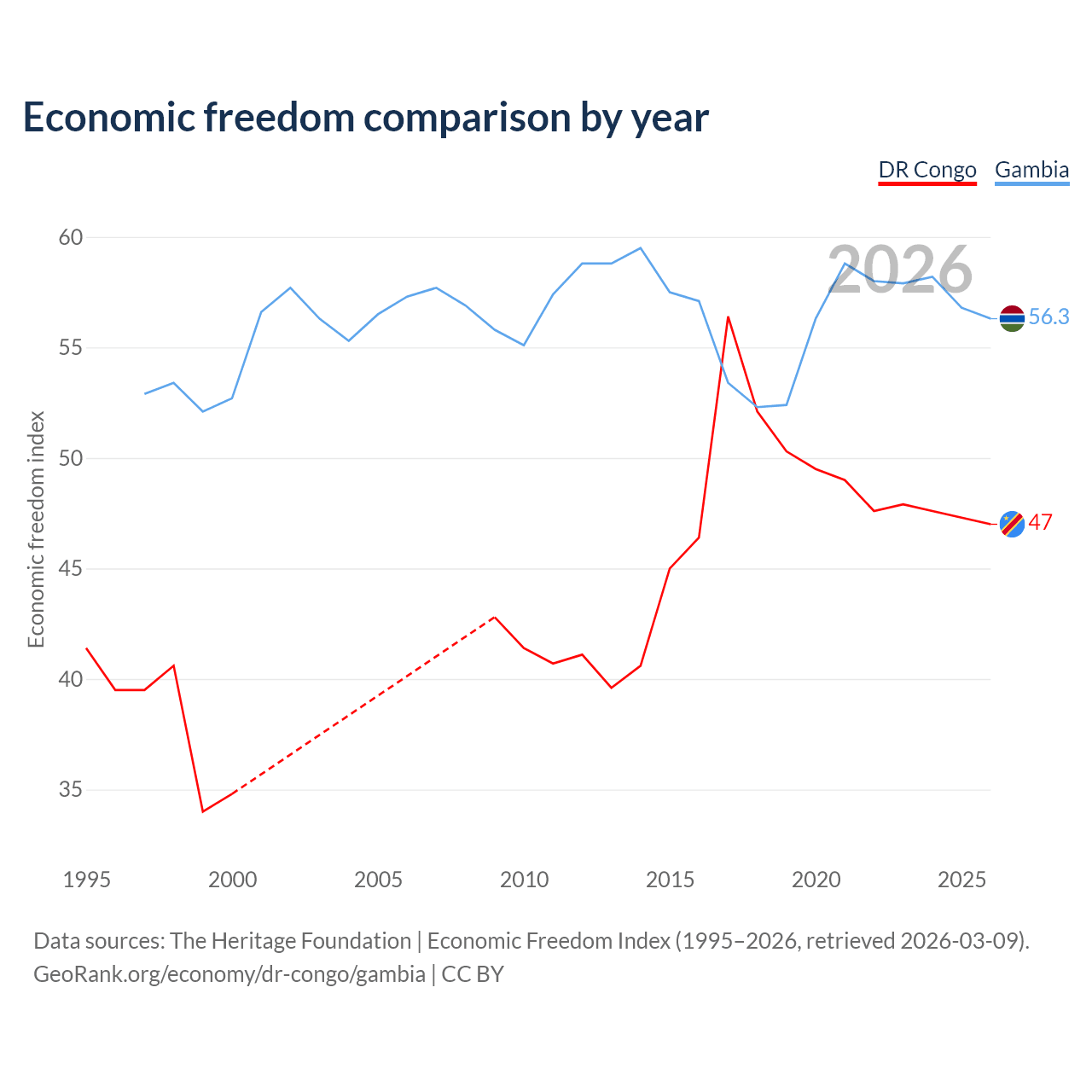 The Economic Freedom Index for the DR Congo is 47, ranking 176/197, compared to 56.3 for the Gambia, ranking 123/197. The chart above displays a comparison of annual changes in economic freedom indexes.