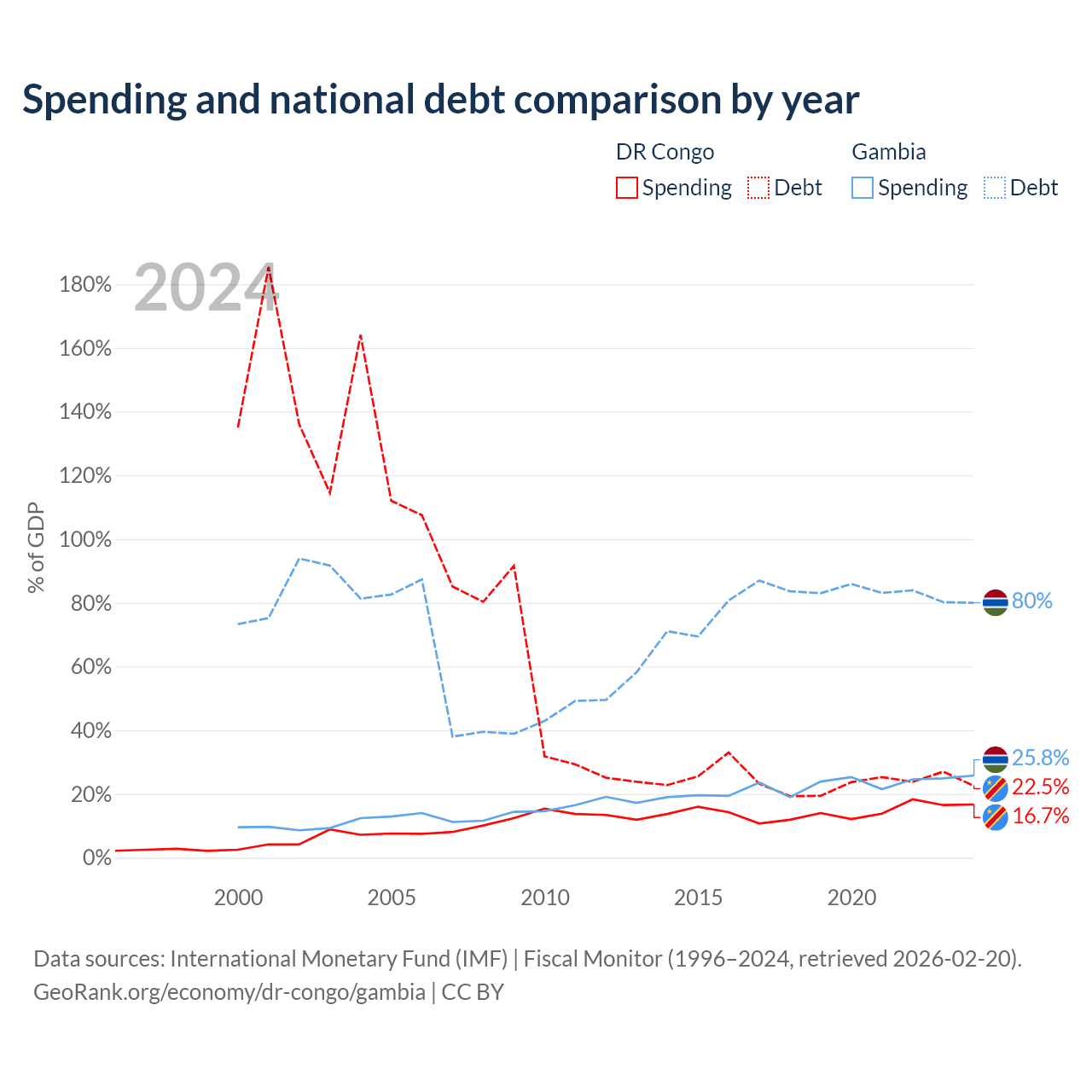 The DR Congo has $16B in government debt (22.5% of GDP), compared to $1.92B (80% of GDP) in the Gambia.