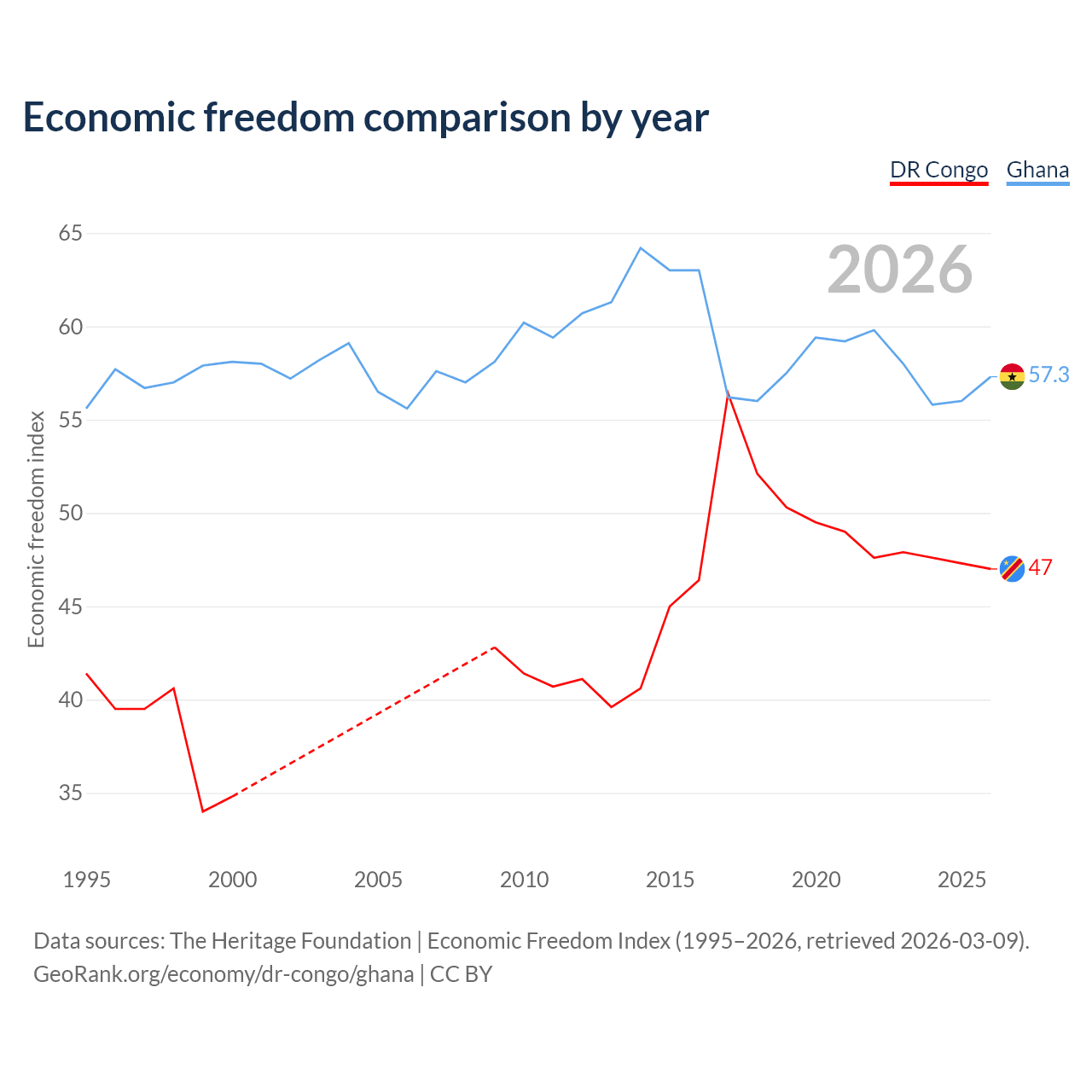The Economic Freedom Index for the DR Congo is 47, ranking 176/197, compared to 57.3 for Ghana, ranking 118/197. The chart above displays a comparison of annual changes in economic freedom indexes.