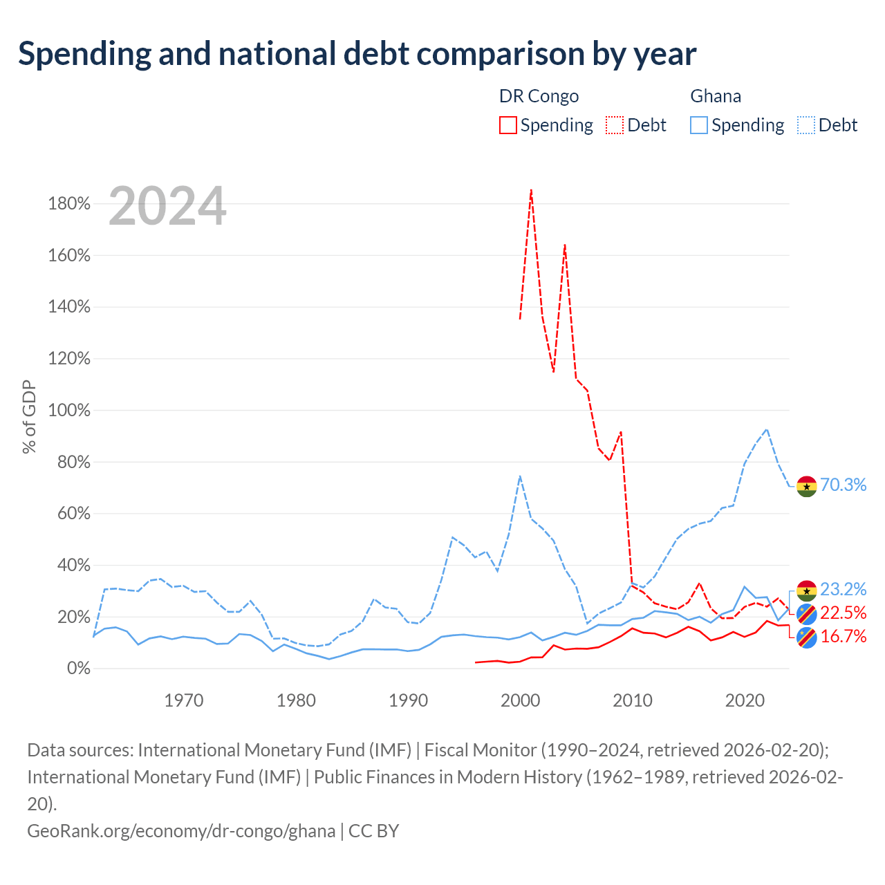 The DR Congo has $16B in government debt (22.5% of GDP), compared to $57.9B (70.3% of GDP) in Ghana.